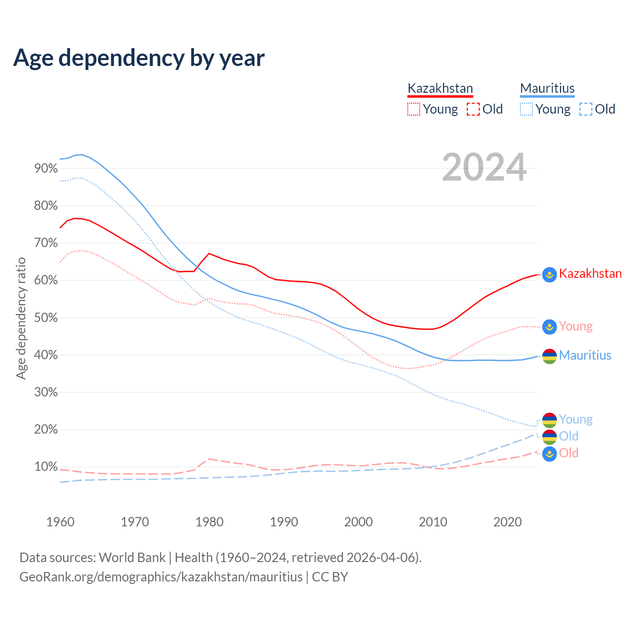 Data sources: World Bank | Health (1960–2024, retrieved 2026-04-06); U.S. Census Bureau (1960–2024, retrieved 2026-02-08).