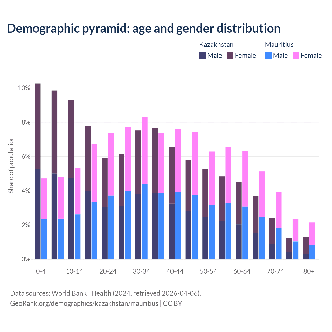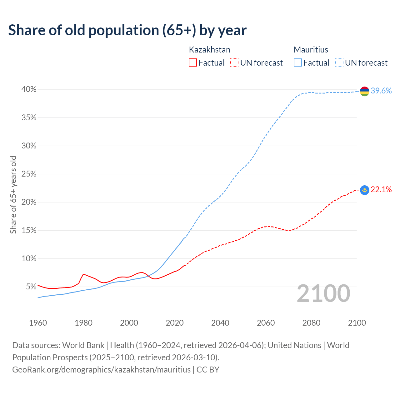 The share of older people aged 65 and over is 8.65% in Kazakhstan and 13.5% in Mauritius. Life expectancy in Kazakhstan compared to Mauritius .