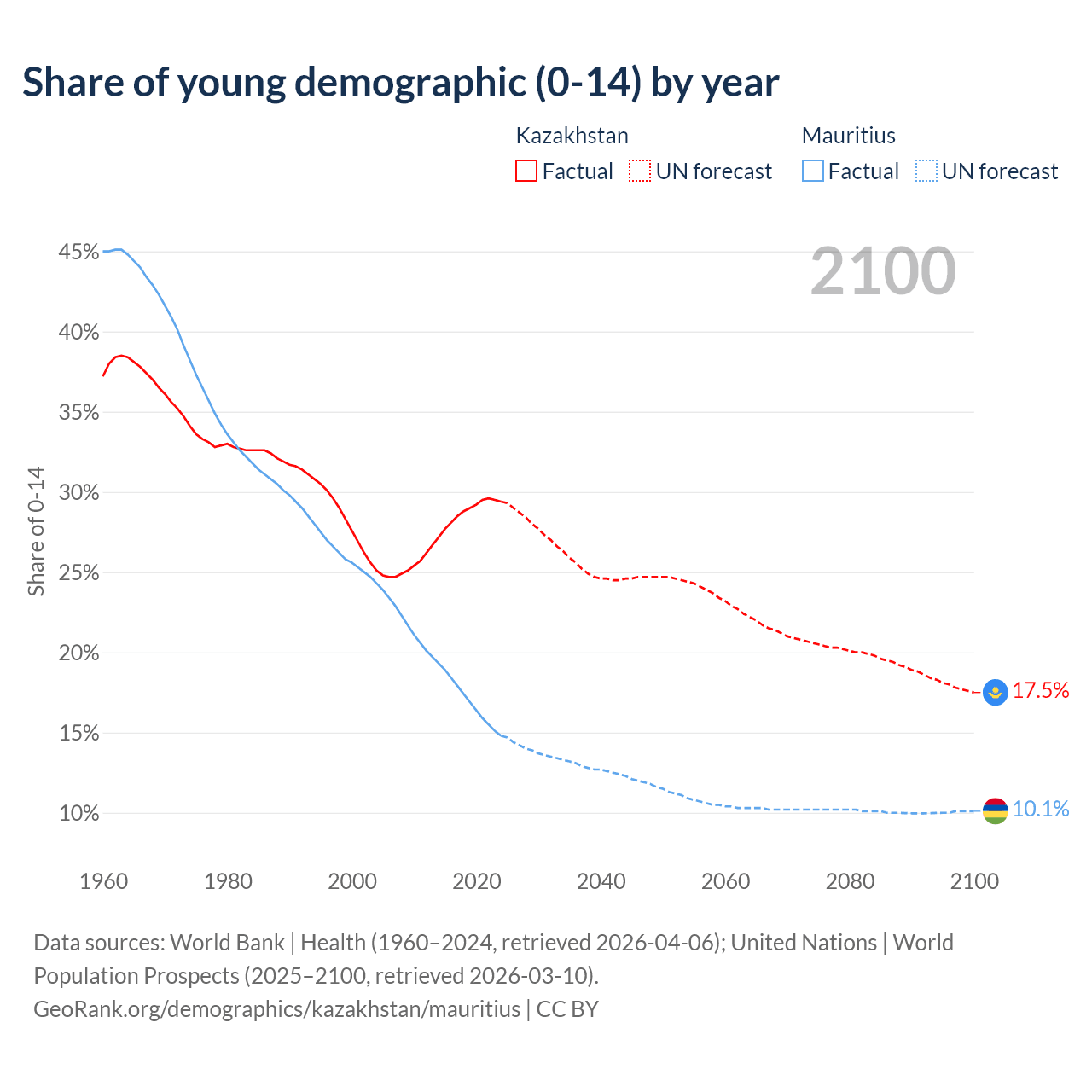- The share of young demographic (0-15 years old) in Kazakhstan is 29.4% vs 14.8% in Mauritius.