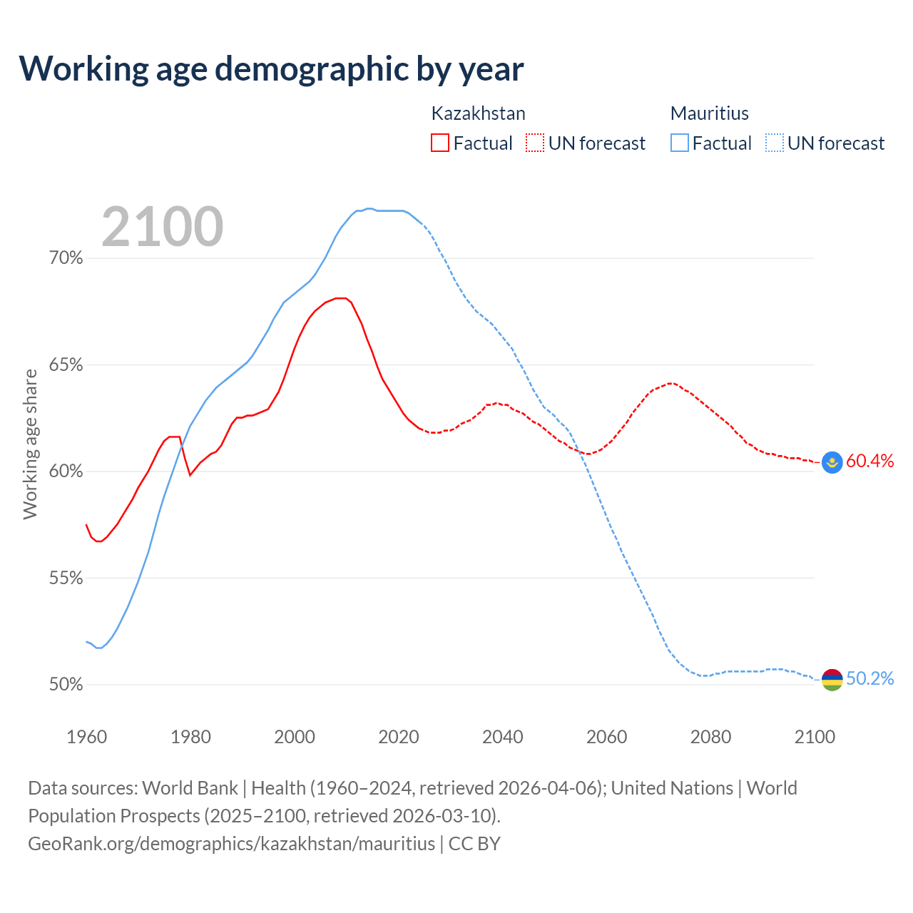 Median age Kazakhstan vs Mauritius, 1960-2100