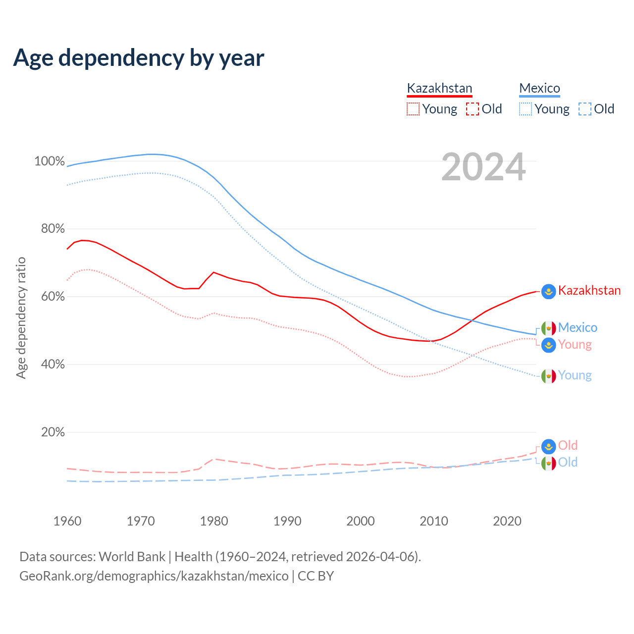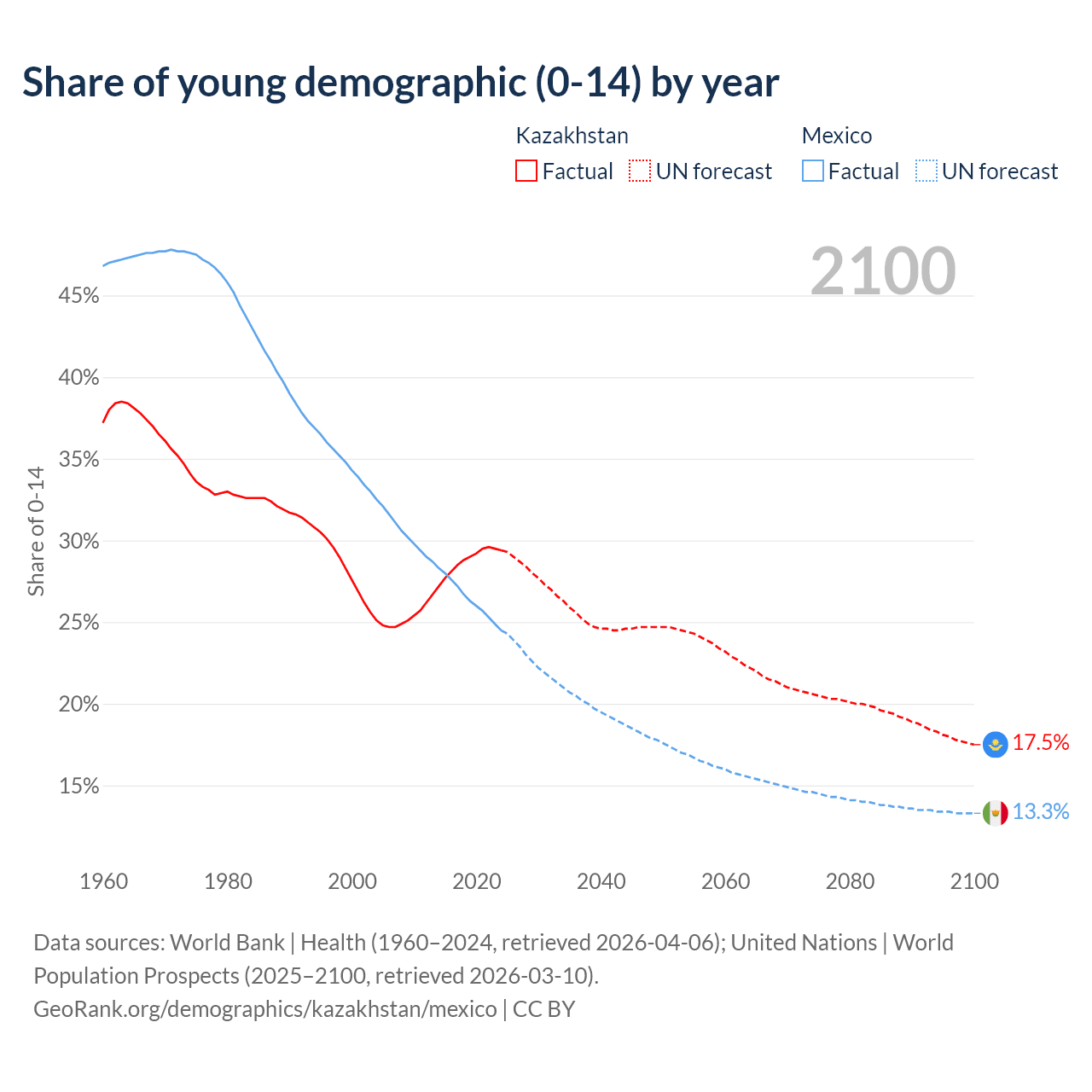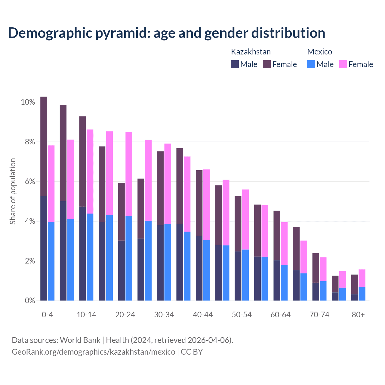 - Kazakhstan is ranked 99/196 by median age (oldest to youngest) vs 102/196 for Mexico.