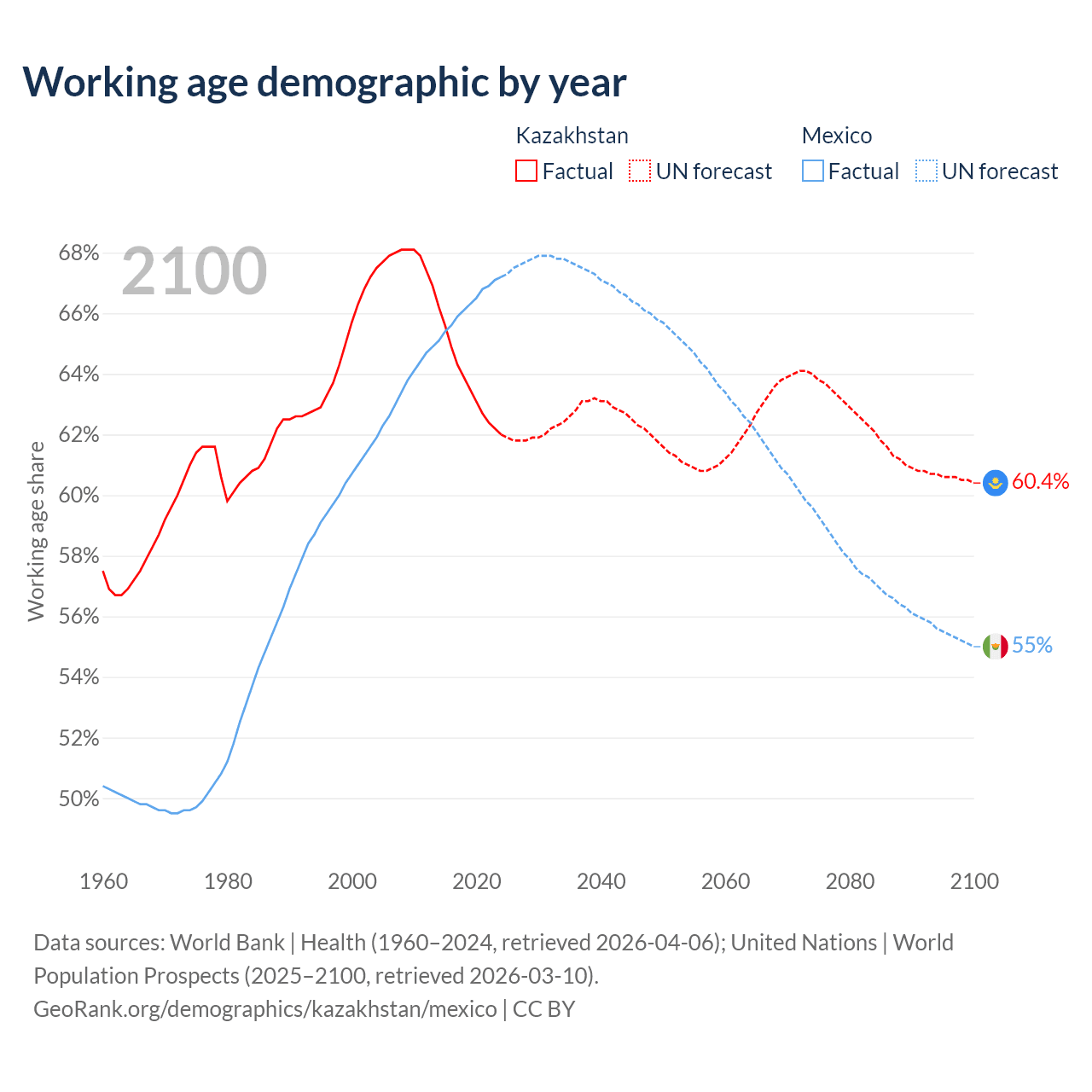 - Kazakhstan has 13.1M working age adults (aged 15-64) vs 89.6M in Mexico.