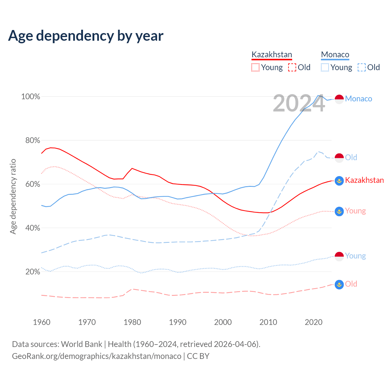 Data sources: World Bank | Health (1960–2024, retrieved 2026-04-06); U.S. Census Bureau (1960–2024, retrieved 2026-02-08).