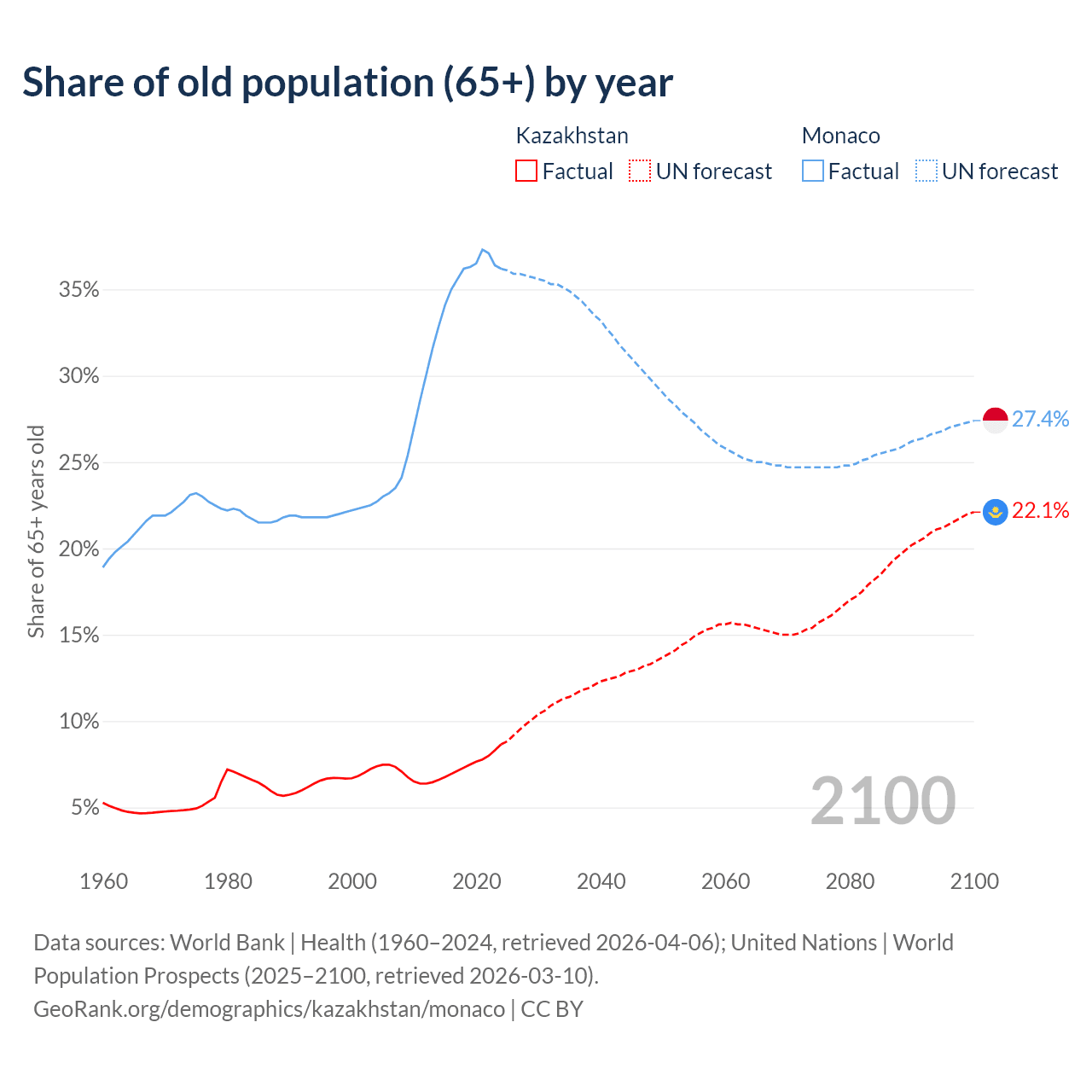 Median age Kazakhstan vs Monaco, 1960-2100