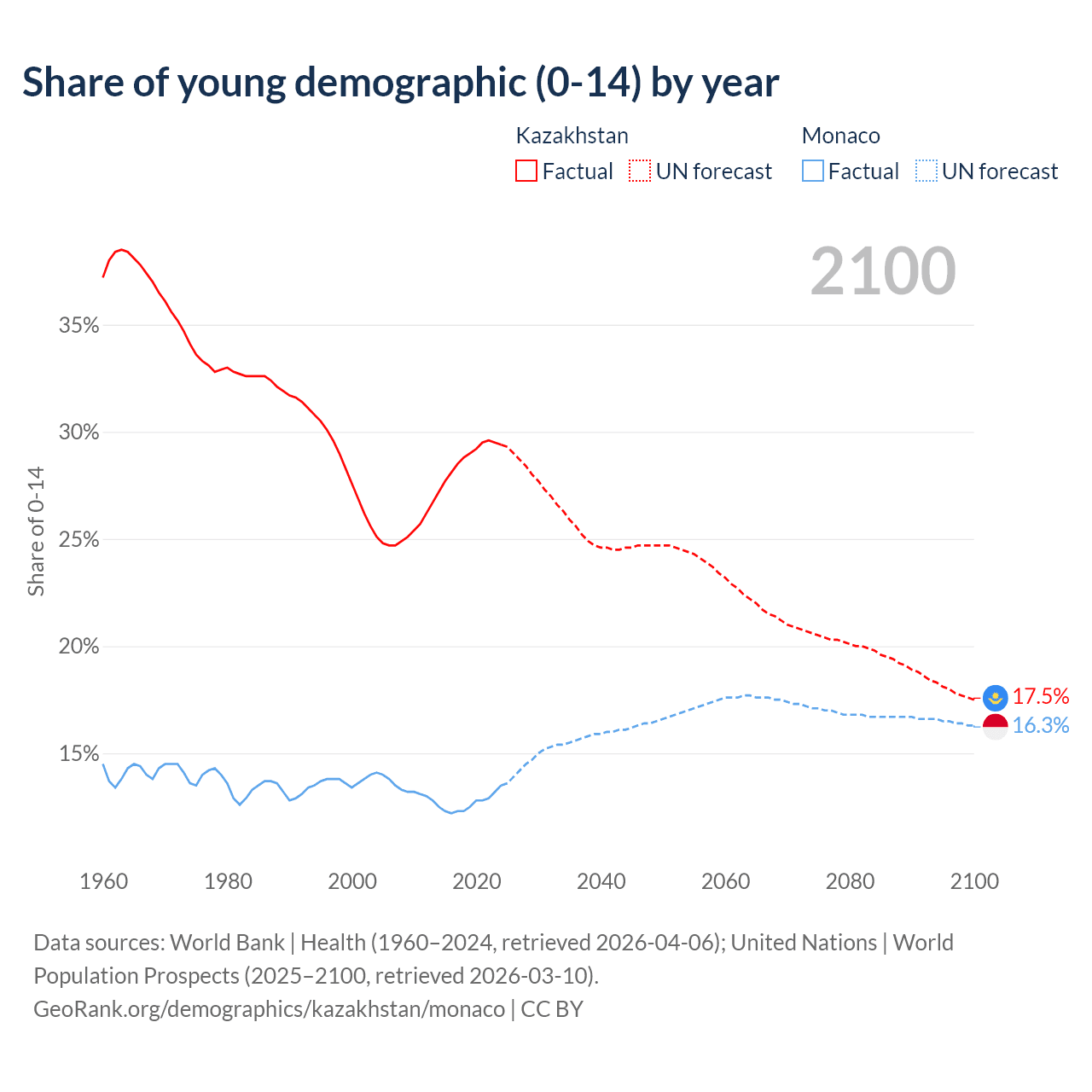 - The share of young demographic (0-15 years old) in Kazakhstan is 29.4% vs 13.5% in Monaco.