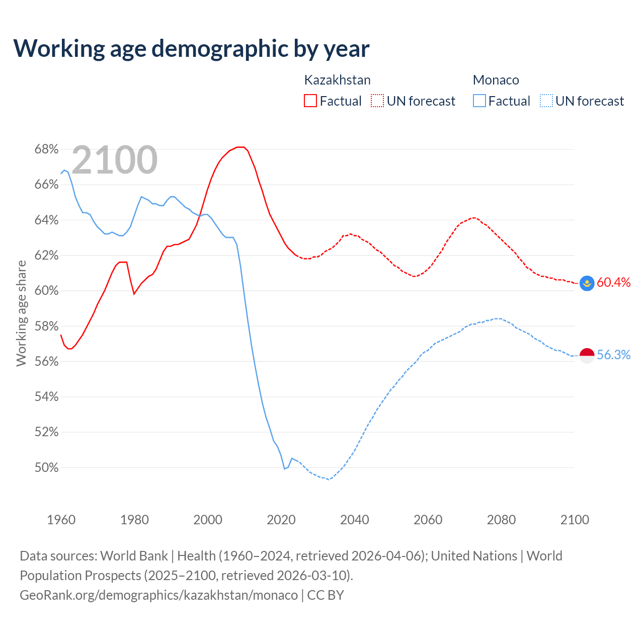 - Kazakhstan has 13.1M working age adults (aged 15-64) vs 19.2K in Monaco.