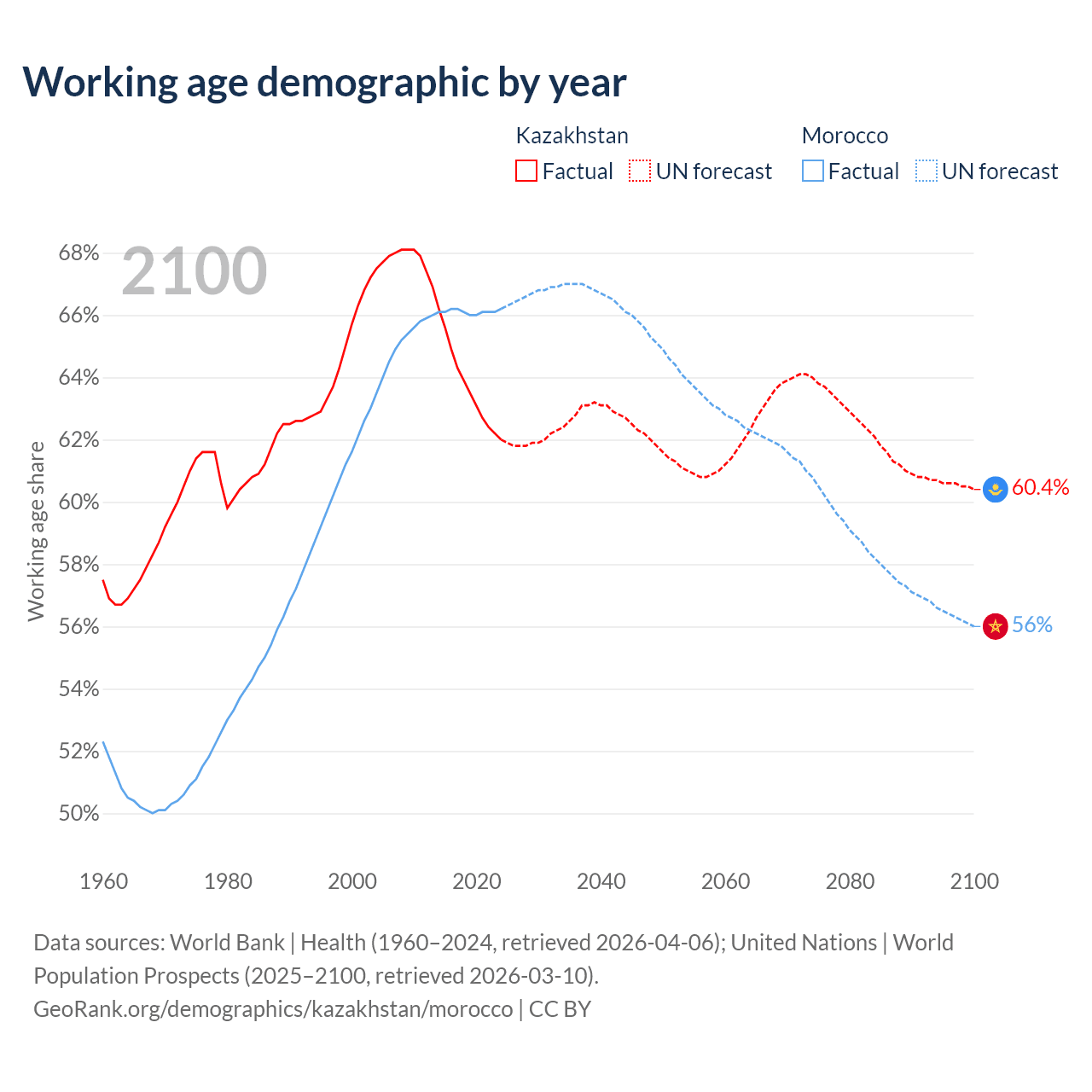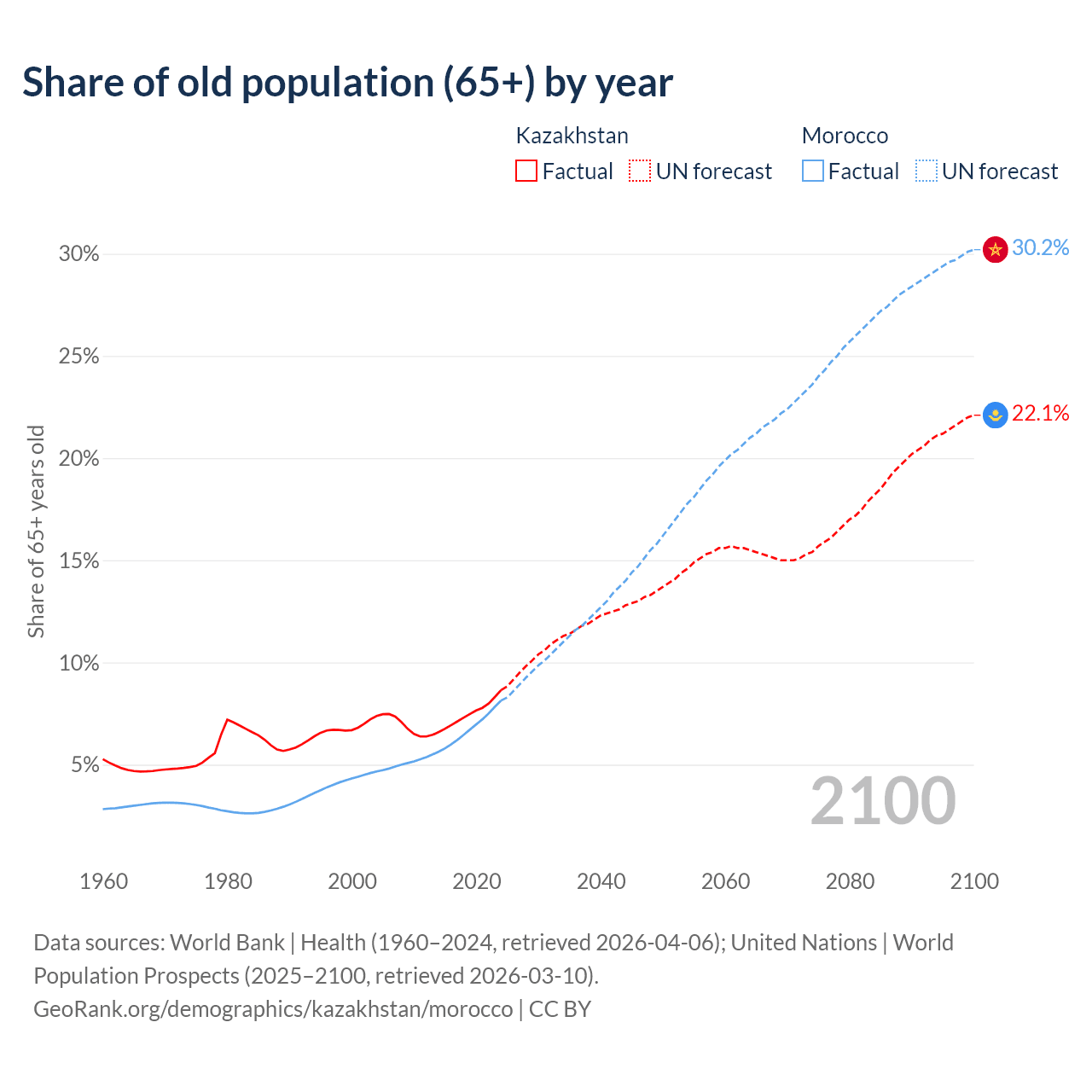 Median age Kazakhstan vs Morocco, 1960-2100