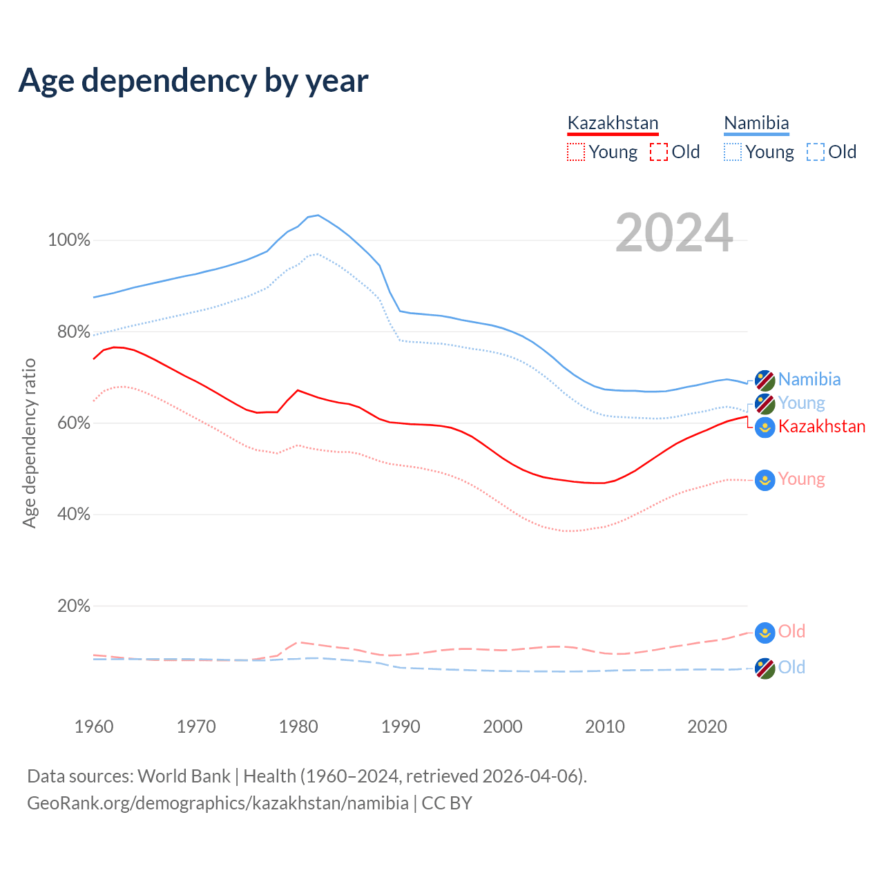 Data sources: World Bank | Health (1960–2024, retrieved 2026-04-06); U.S. Census Bureau (1960–2024, retrieved 2026-02-08).