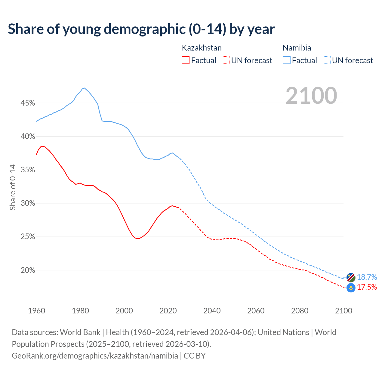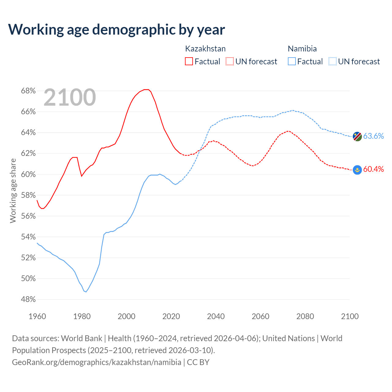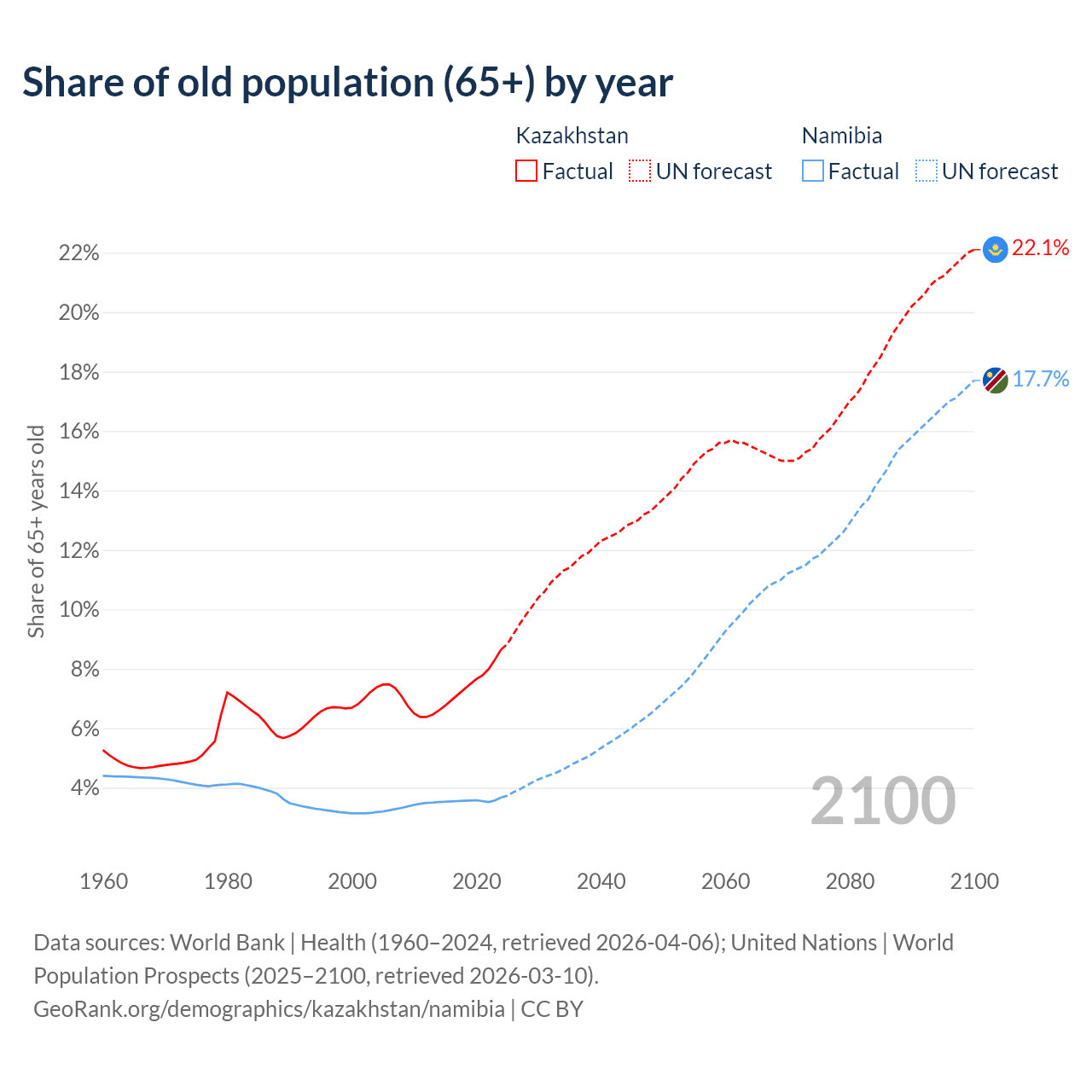 Median age Kazakhstan vs Namibia, 1960-2100