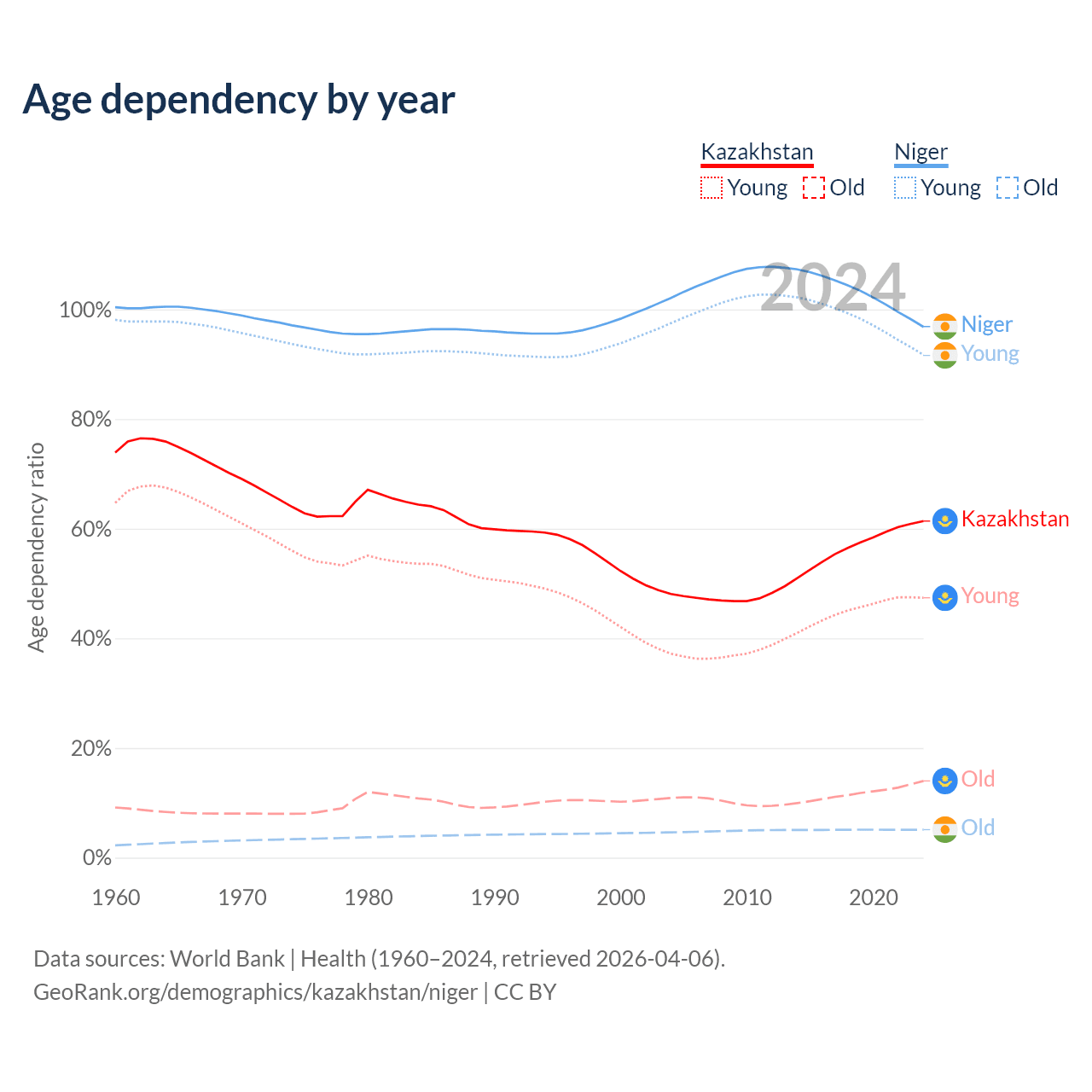 Data sources: World Bank | Health (1960–2024, retrieved 2026-04-06); U.S. Census Bureau (1960–2024, retrieved 2026-02-08).