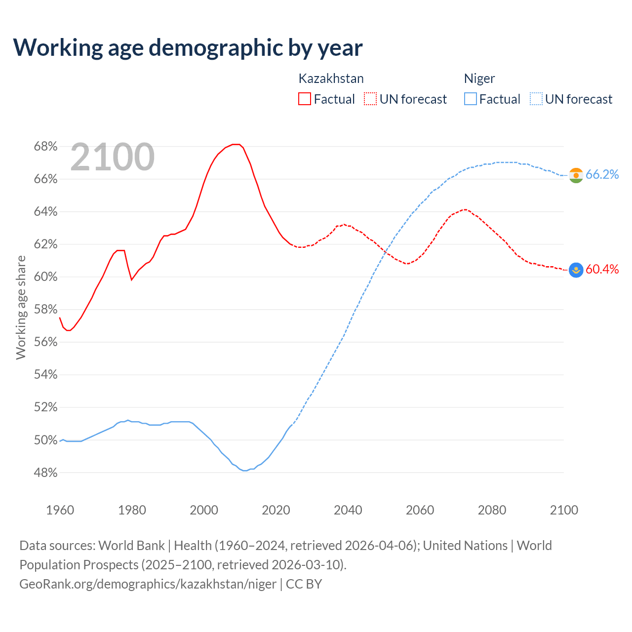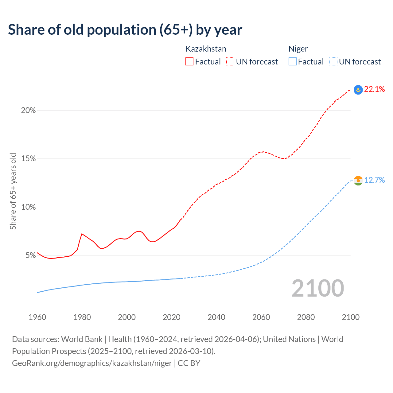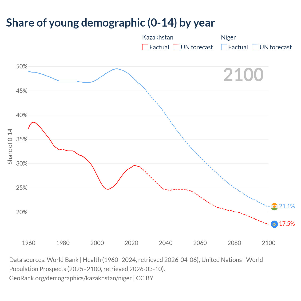 Median age Kazakhstan vs Niger, 1960-2100