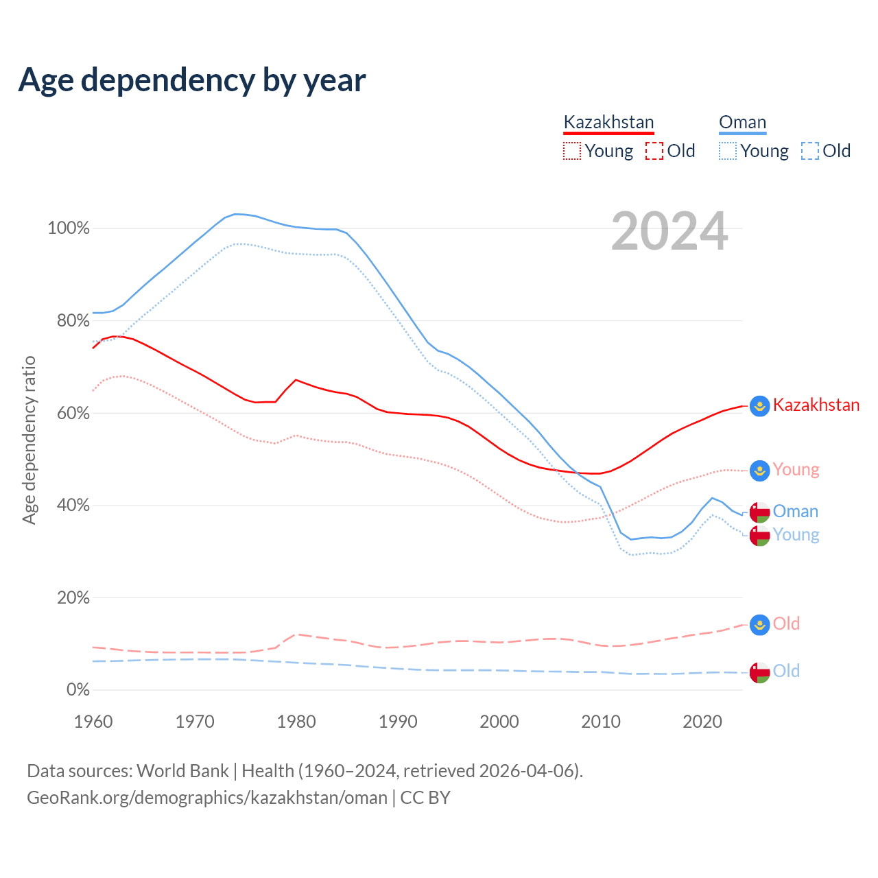 Data sources: World Bank | Health (1960–2024, retrieved 2026-04-06); U.S. Census Bureau (1960–2024, retrieved 2026-02-08).