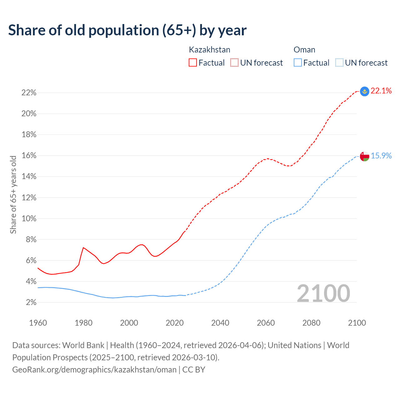 The share of older people aged 65 and over is 8.65% in Kazakhstan and 2.64% in Oman. Life expectancy in Kazakhstan compared to Oman .