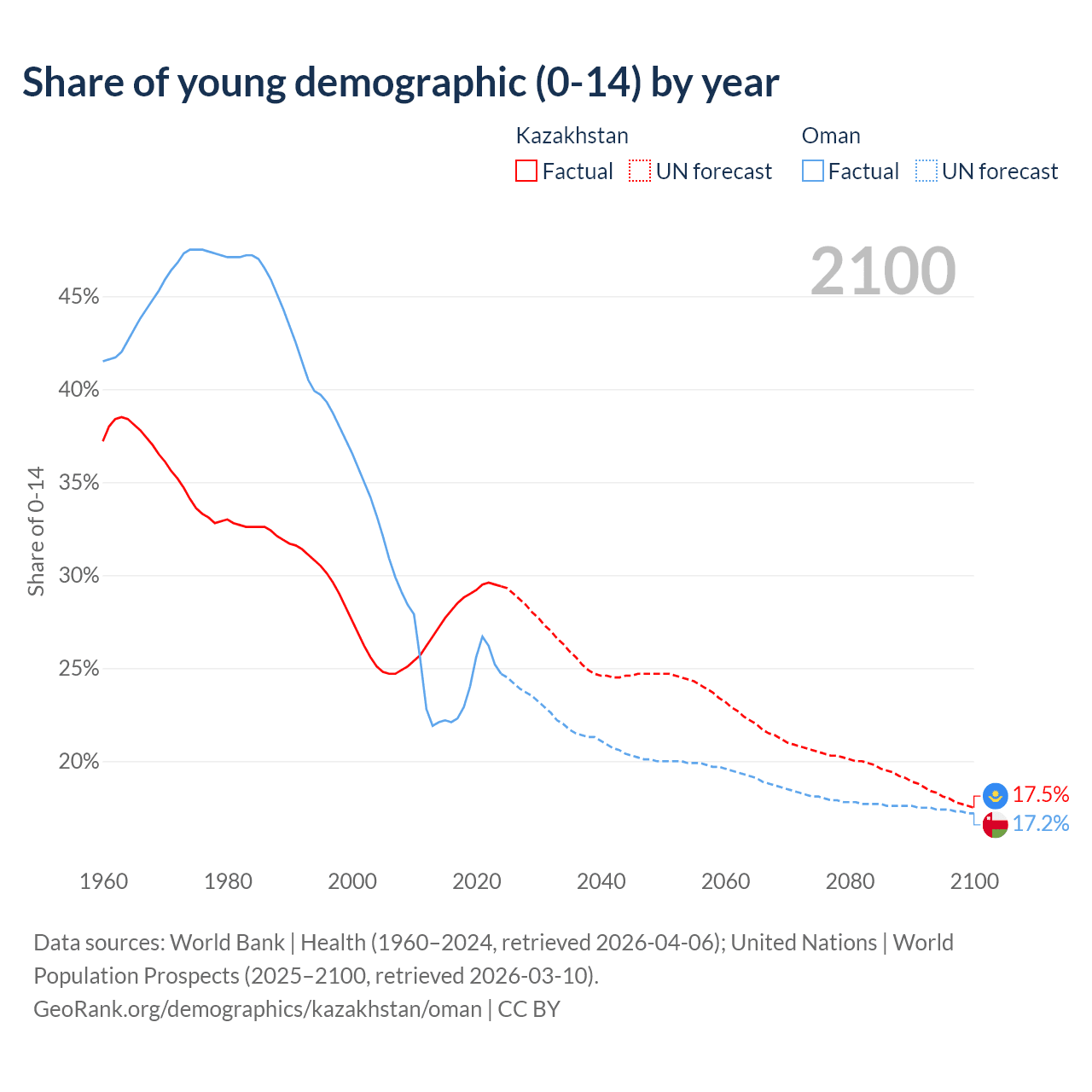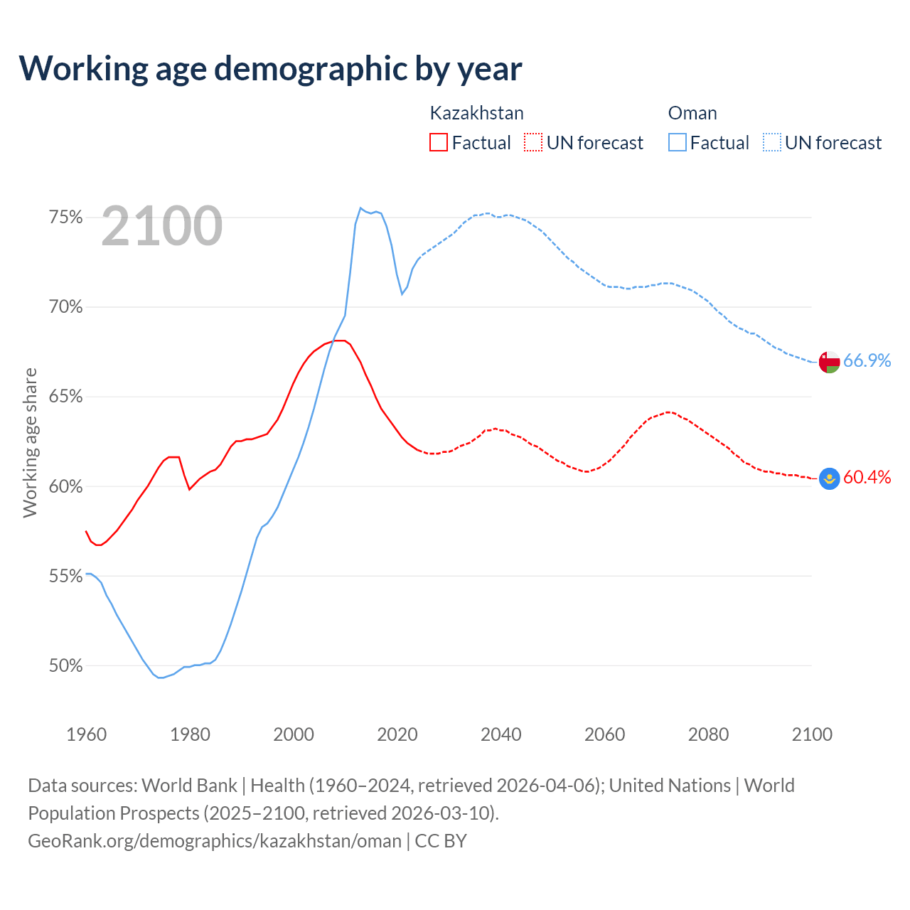 Median age Kazakhstan vs Oman, 1960-2100
