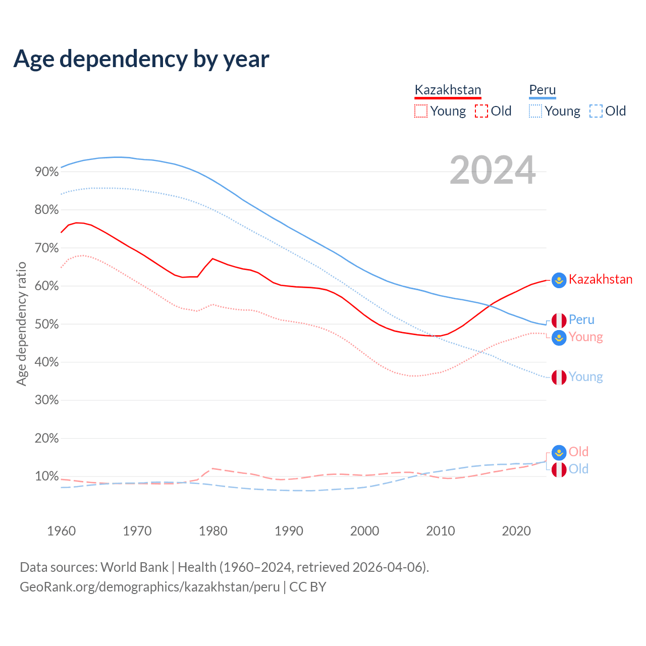 Data sources: World Bank | Health (1960–2024, retrieved 2026-04-06); U.S. Census Bureau (1960–2024, retrieved 2026-02-08).