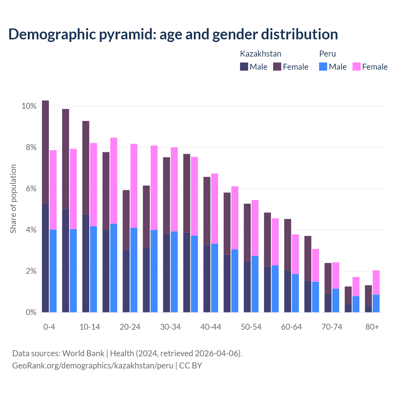 - Kazakhstan is ranked 99/196 by median age (oldest to youngest) vs 97/196 for Peru.