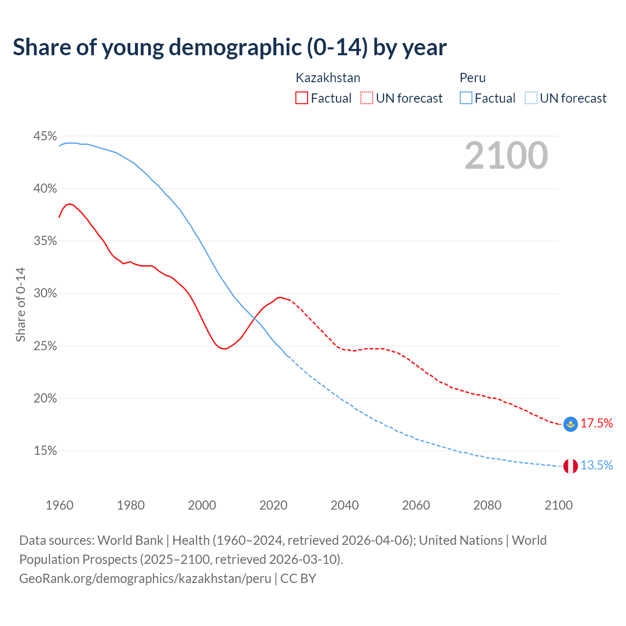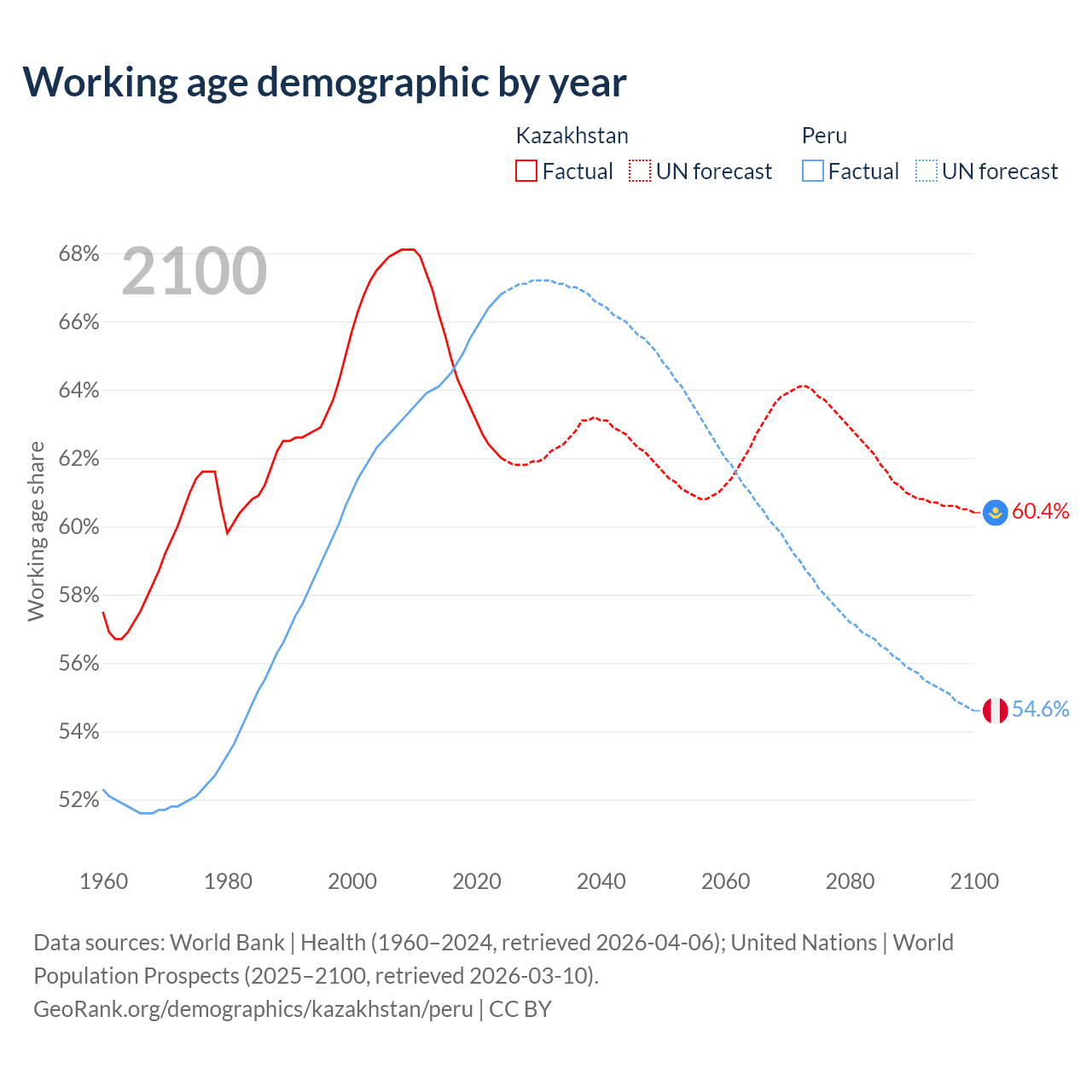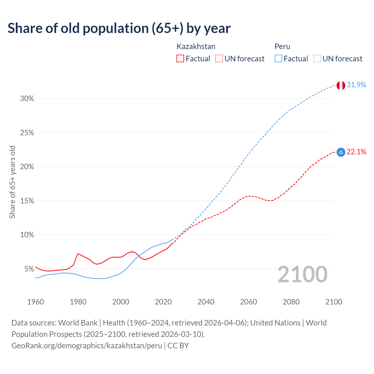 Median age Kazakhstan vs Peru, 1960-2100