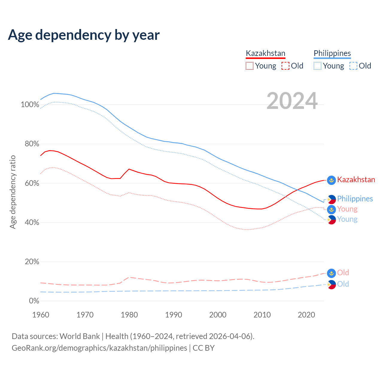 Data sources: World Bank | Health (1960–2024, retrieved 2026-04-06); U.S. Census Bureau (1960–2024, retrieved 2026-02-08).