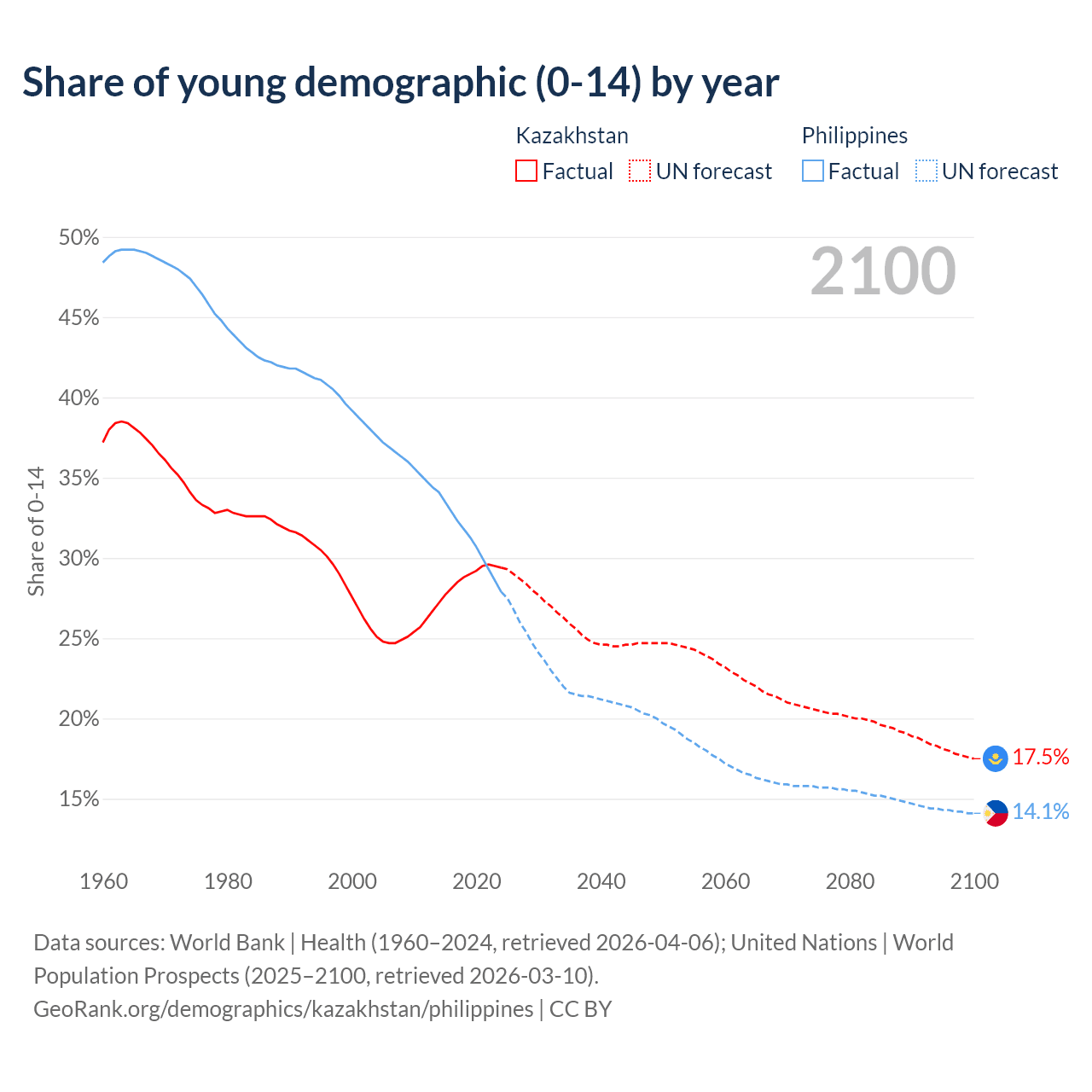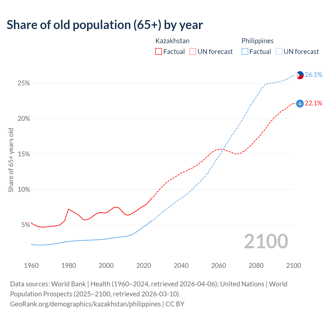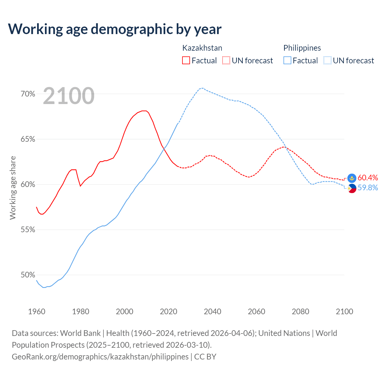 Median age Kazakhstan vs Philippines, 1960-2100