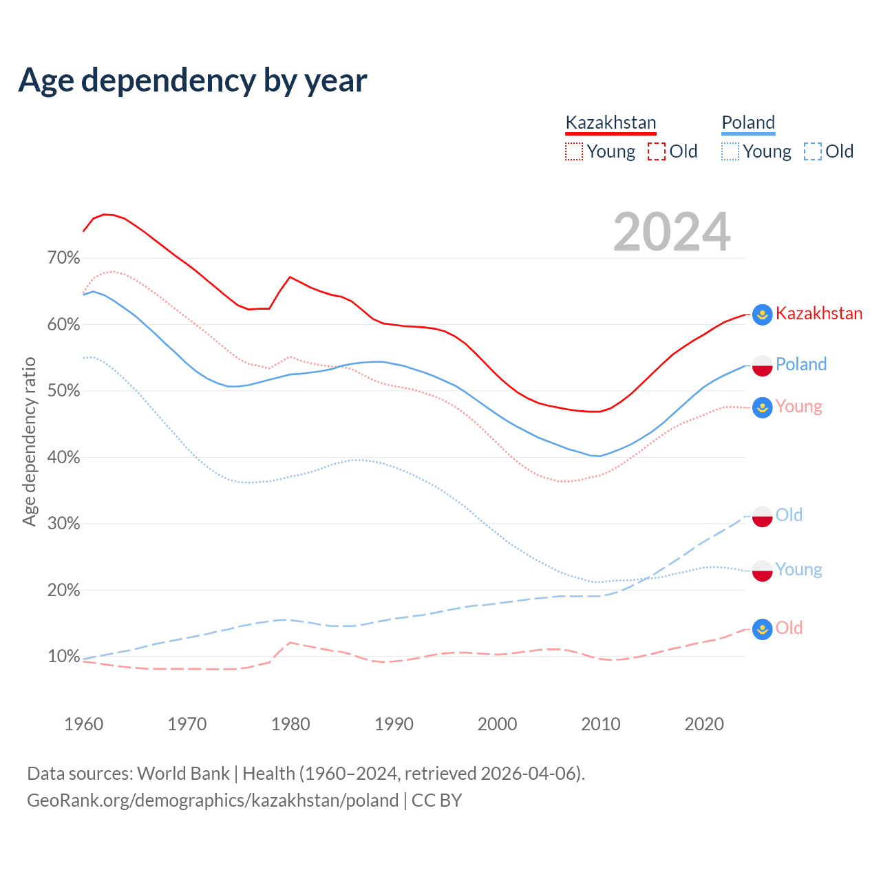 The share of older people aged 65 and over is 8.65% in Kazakhstan and 20.1% in Poland. Life expectancy in Kazakhstan compared to Poland .