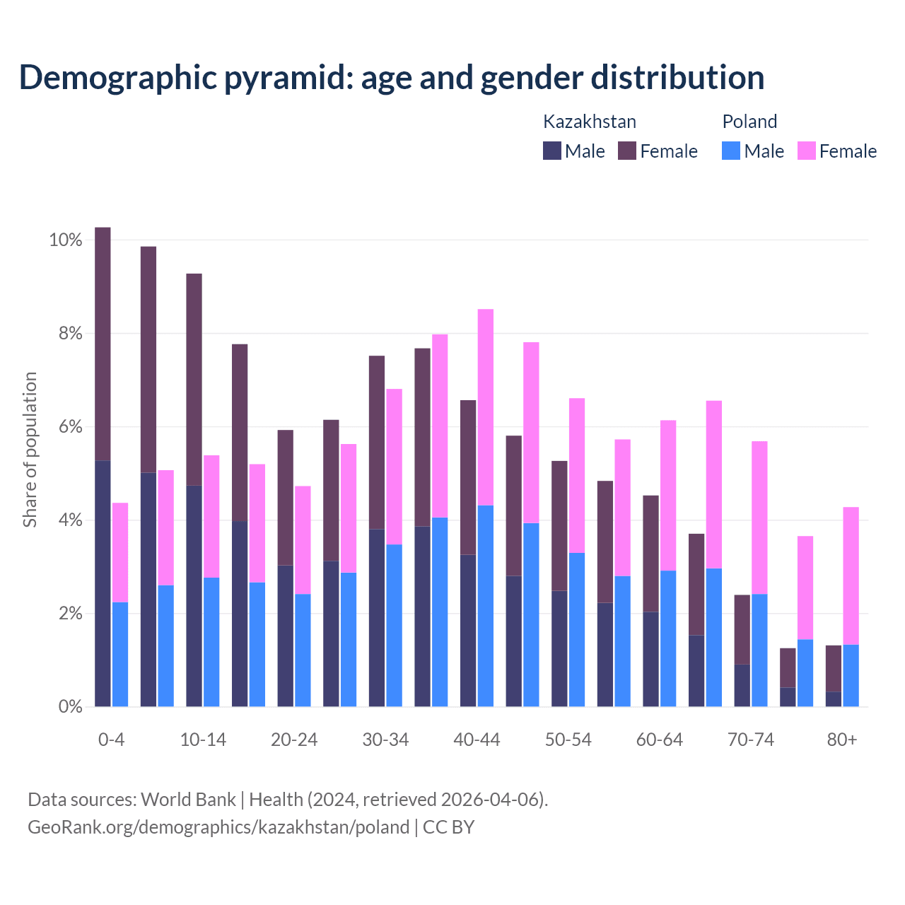 - Kazakhstan is ranked 99/196 by median age (oldest to youngest) vs 30/196 for Poland.