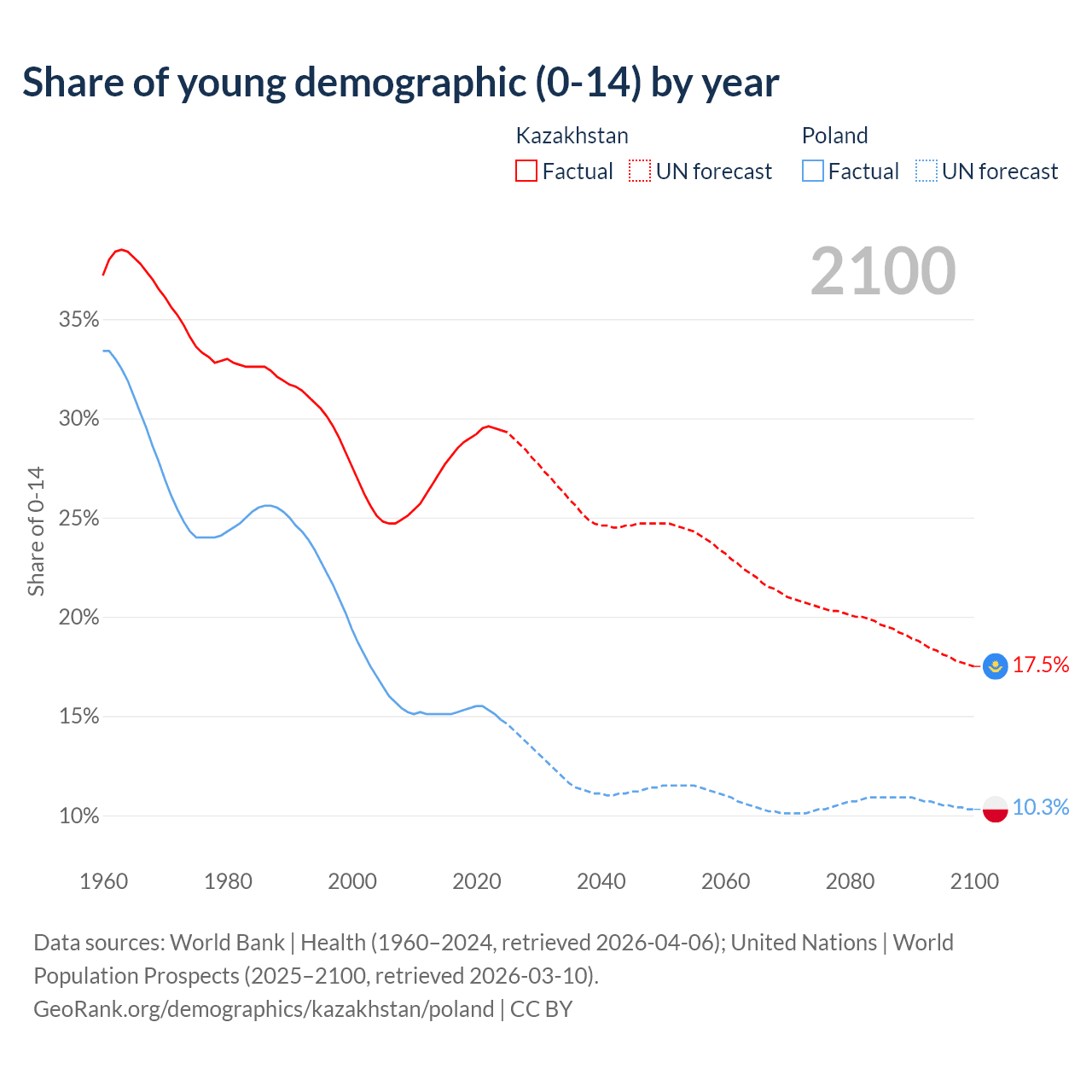 - The share of young demographic (0-15 years old) in Kazakhstan is 29.4% vs 14.8% in Poland.