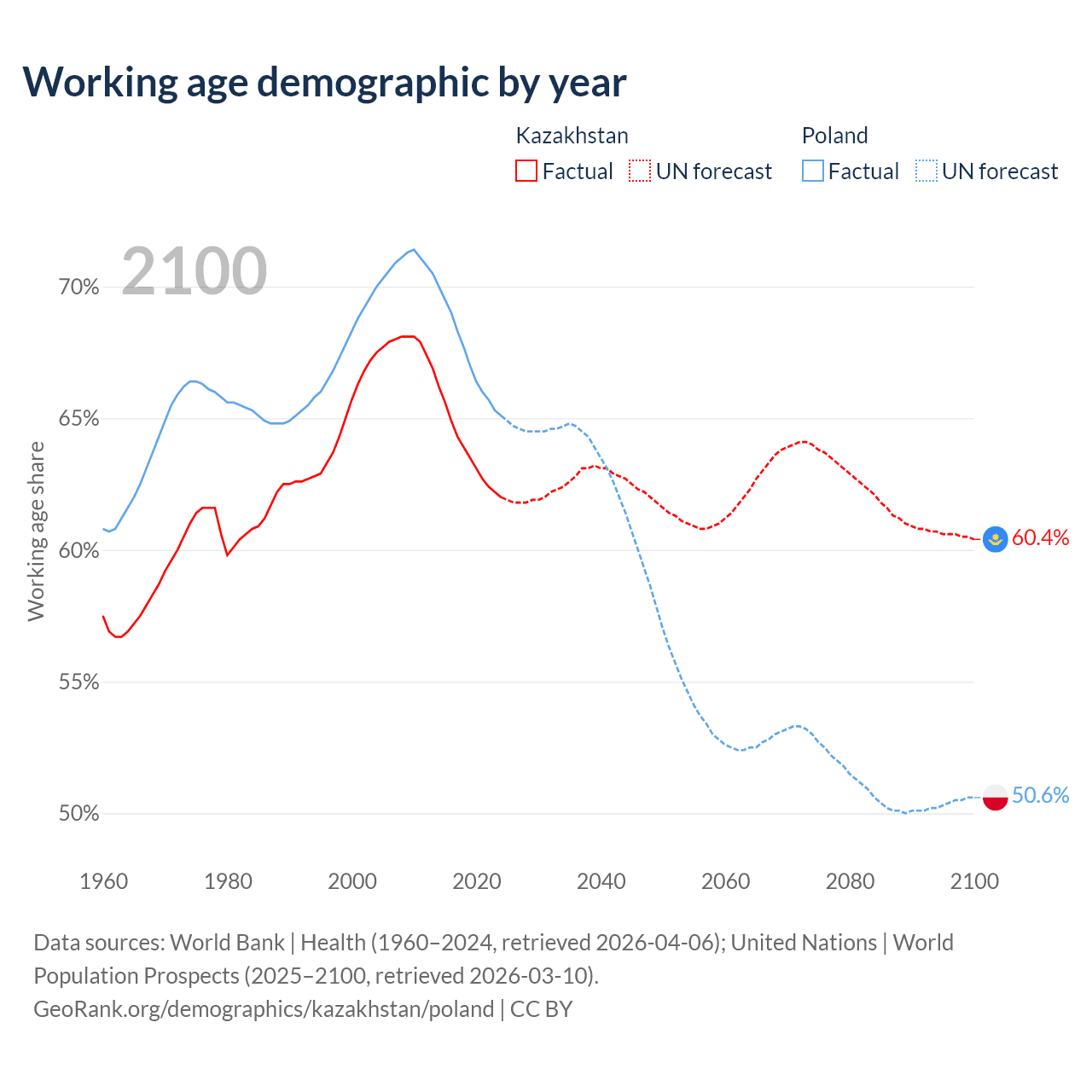 - Kazakhstan has 13.1M working age adults (aged 15-64) vs 23.3M in Poland.
