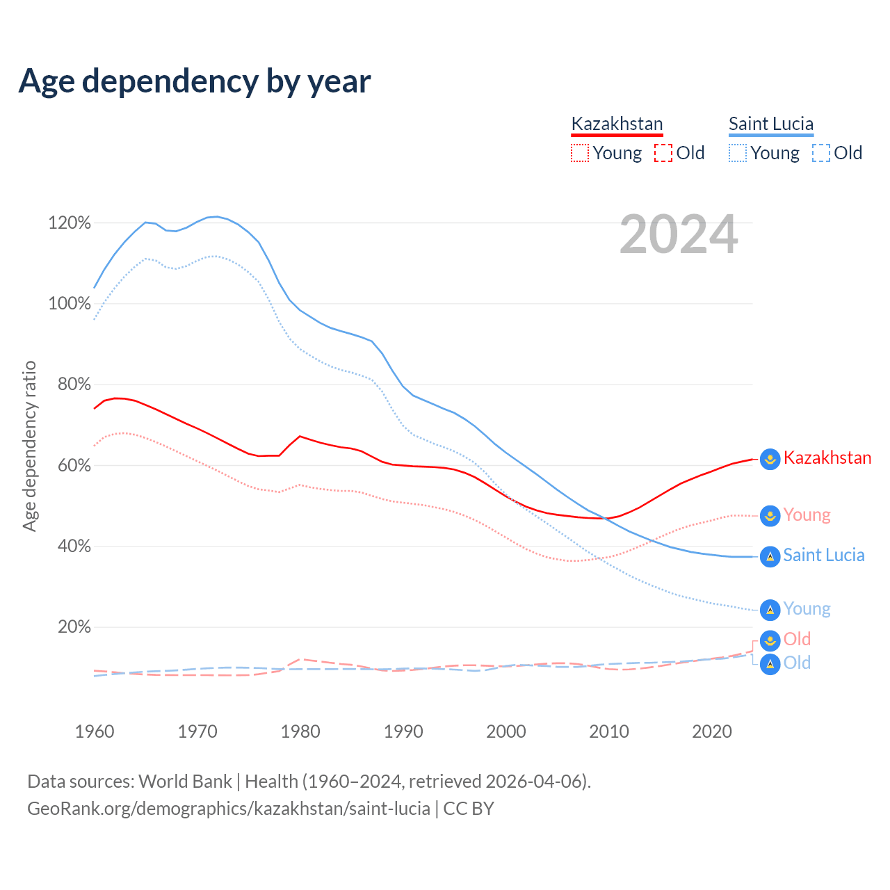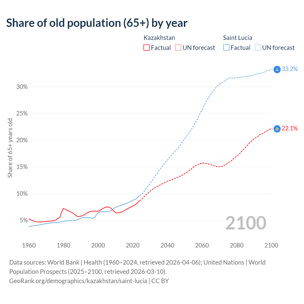 - The share of old-age demographic (65+) in Kazakhstan is 8.65% vs 9.62% in Saint Lucia.