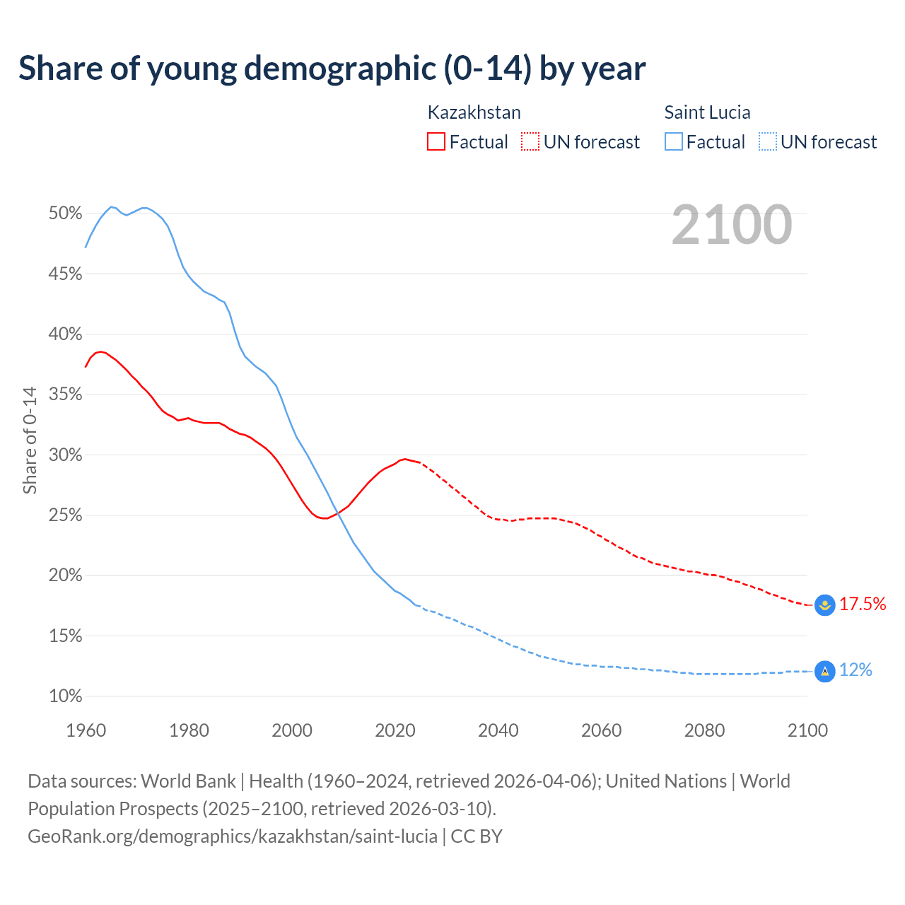 - The share of young demographic (0-15 years old) in Kazakhstan is 29.4% vs 17.5% in Saint Lucia.