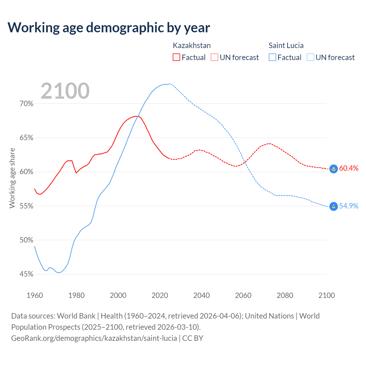 - Kazakhstan has 13.1M working age adults (aged 15-64) vs 132K in Saint Lucia.
