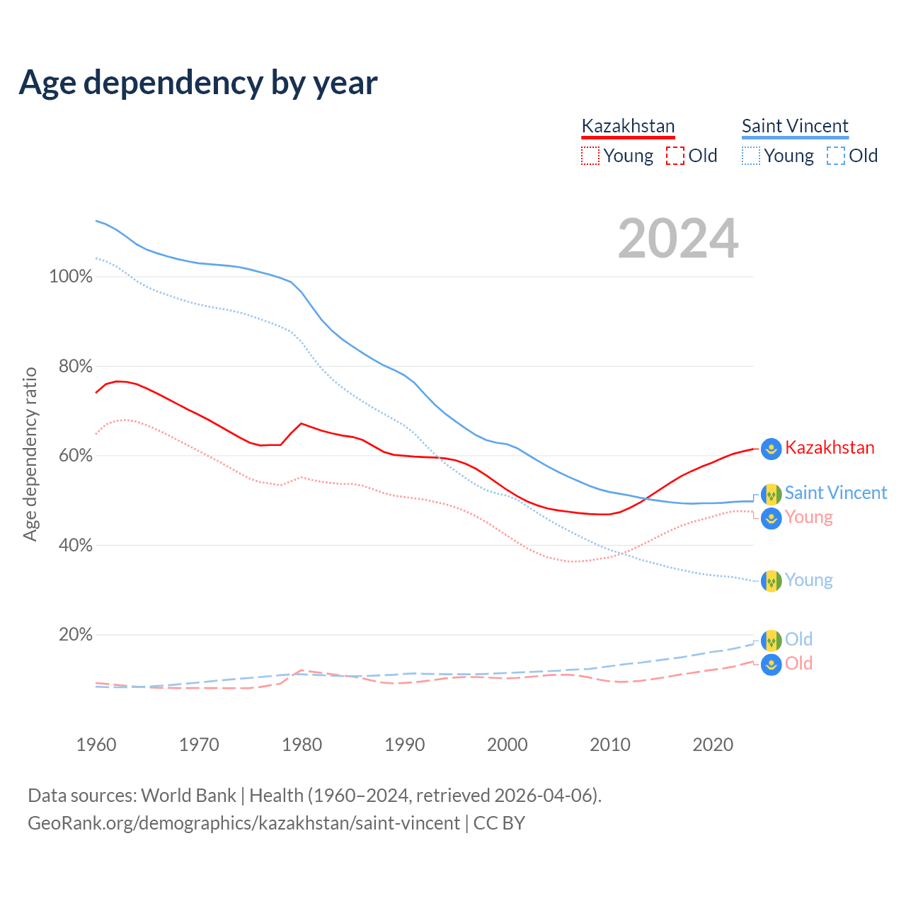 - The share of young demographic (0-15 years old) in Kazakhstan is 29.4% vs 21.3% in Saint Vincent.