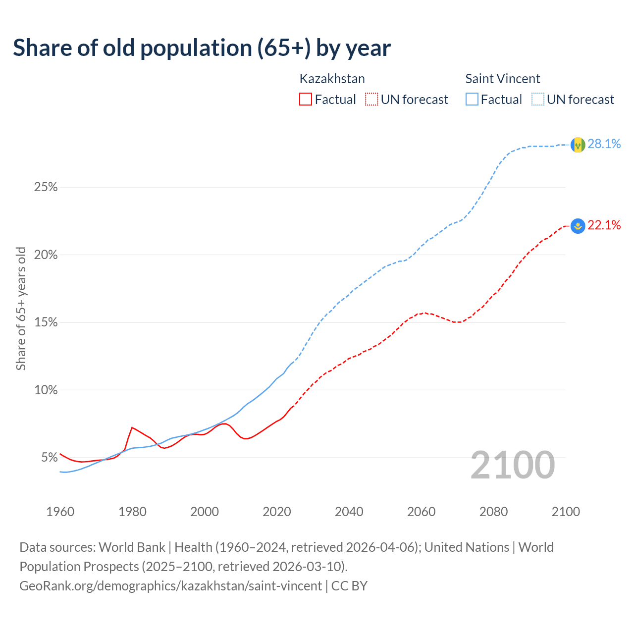 - The share of old-age demographic (65+) in Kazakhstan is 8.65% vs 11.9% in Saint Vincent.