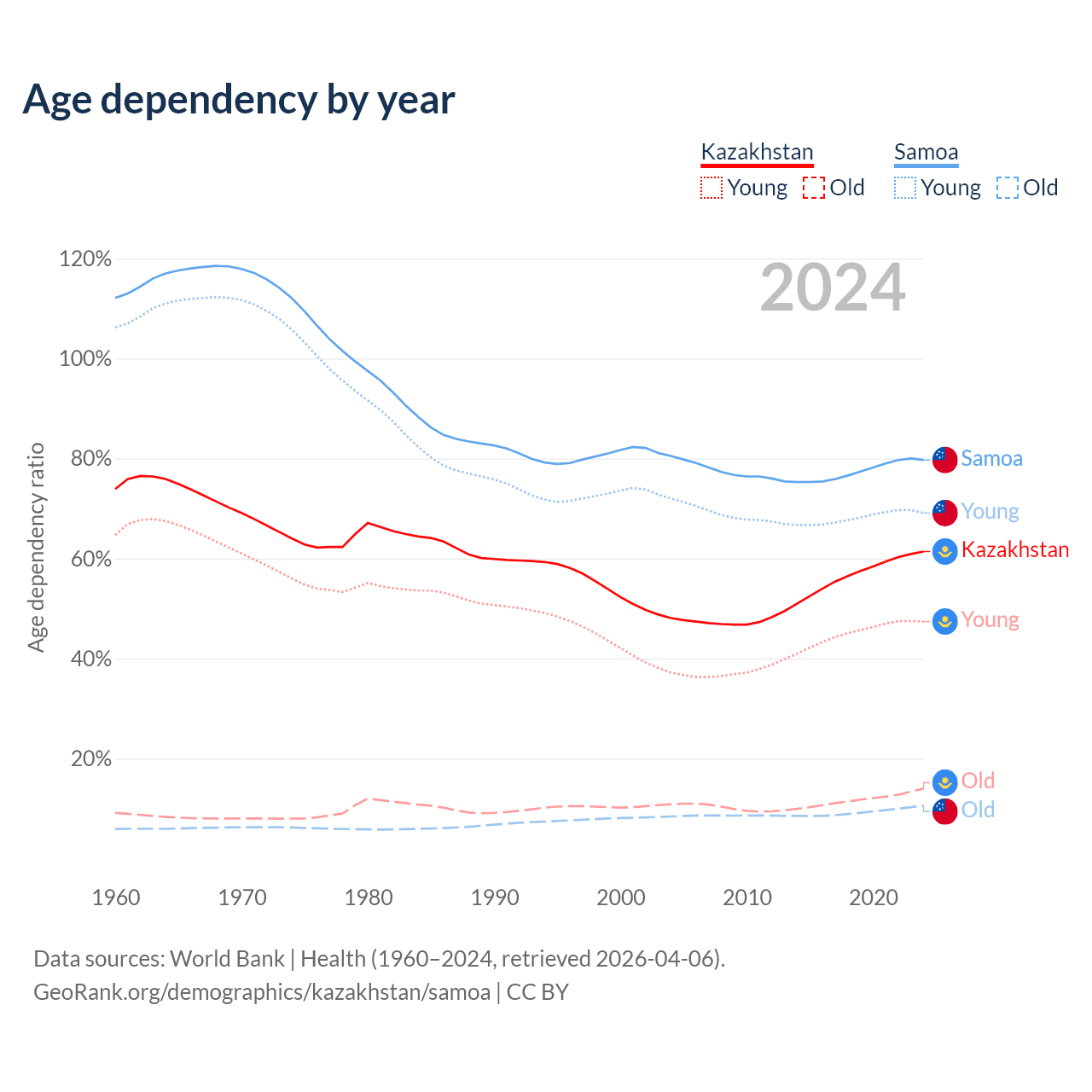 - The share of old-age demographic (65+) in Kazakhstan is 8.65% vs 5.88% in Samoa.