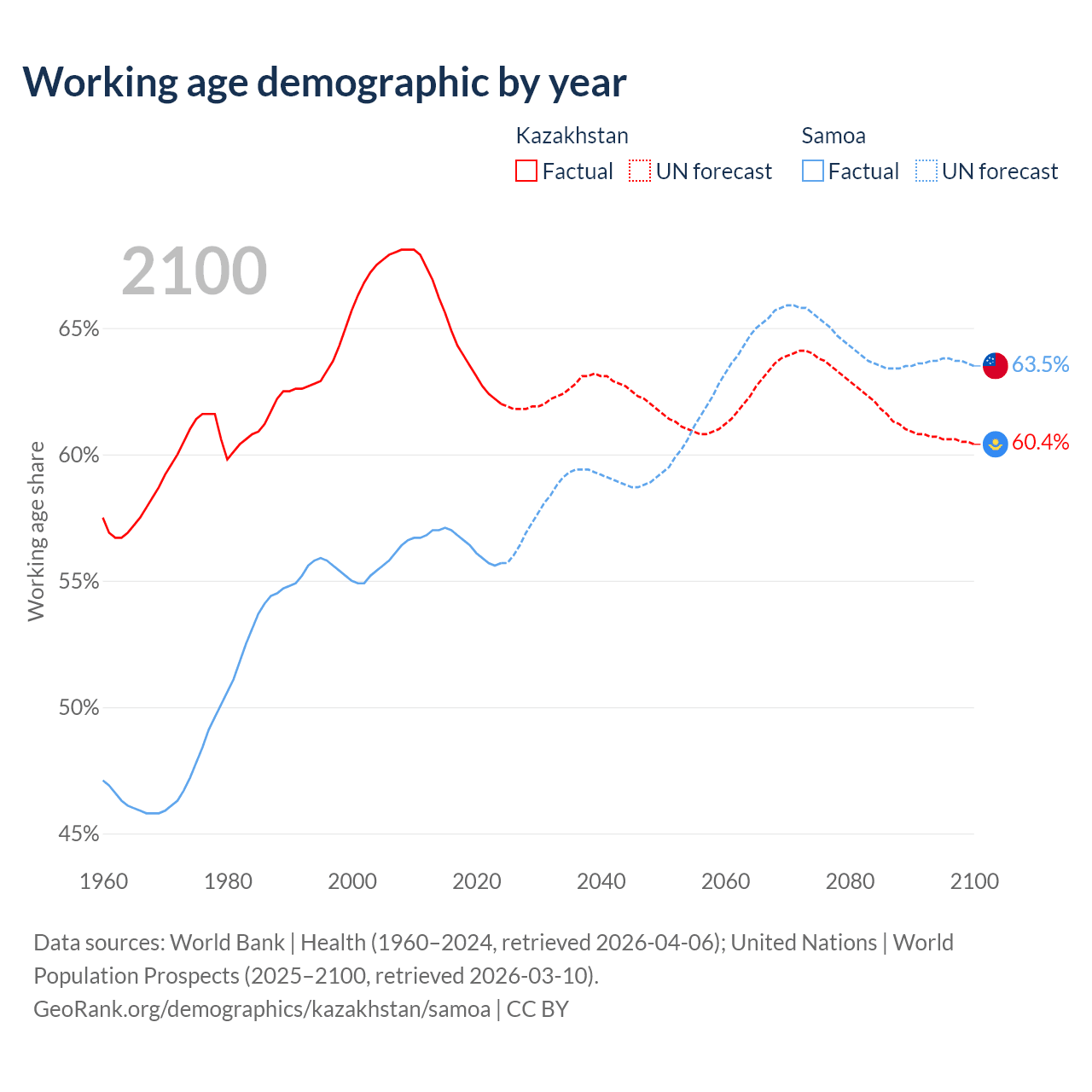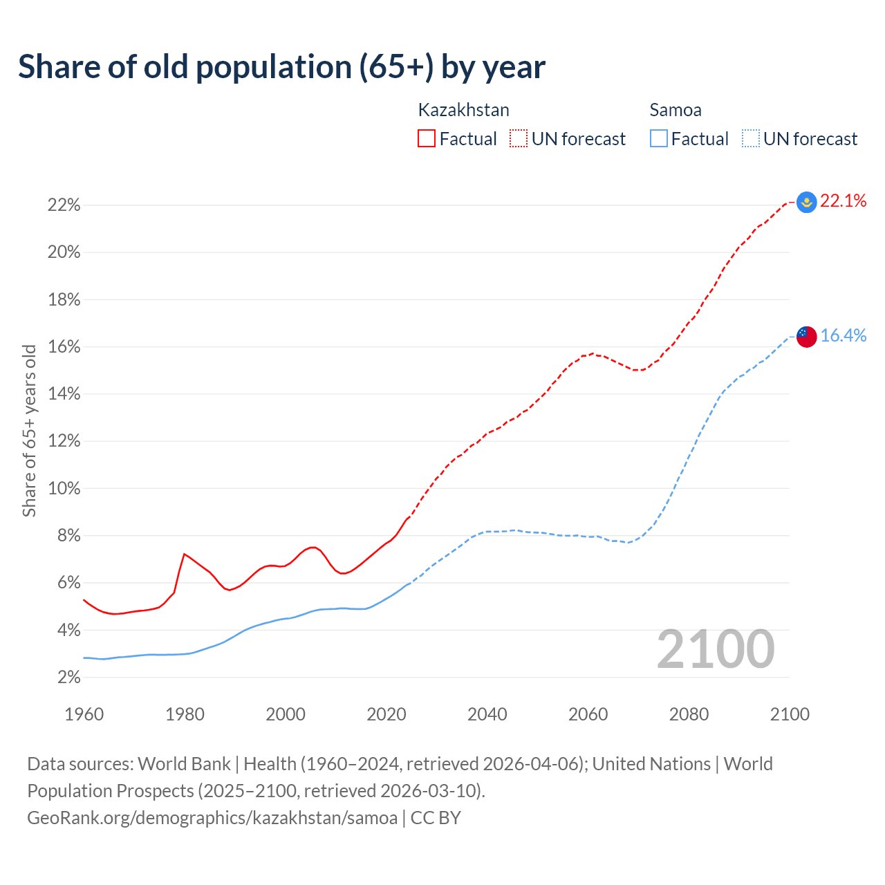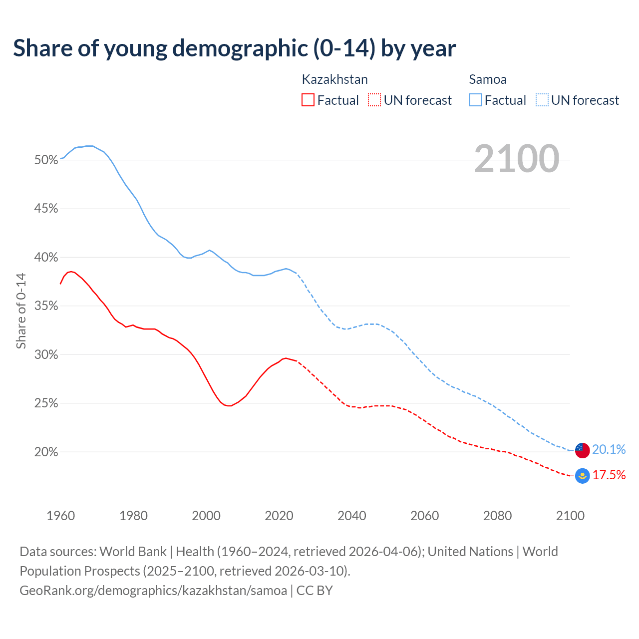 Median age Kazakhstan vs Samoa, 1960-2100