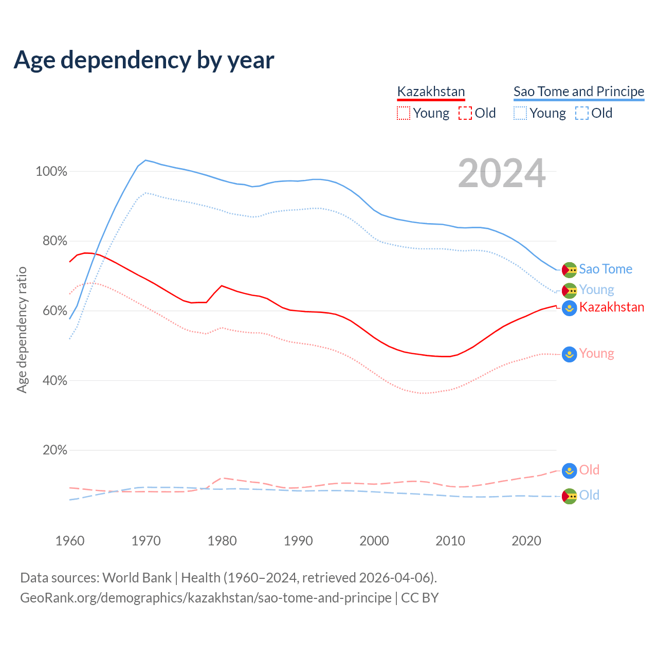 - Kazakhstan is ranked 99/196 by median age (oldest to youngest) vs 163/196 for Sao Tome and Principe.