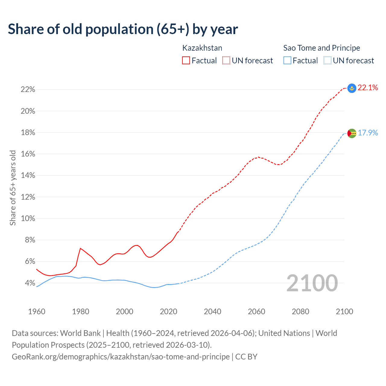 The share of older people aged 65 and over is 8.65% in Kazakhstan and 3.9% in Sao Tome and Principe. Life expectancy in Kazakhstan compared to Sao Tome and Principe .