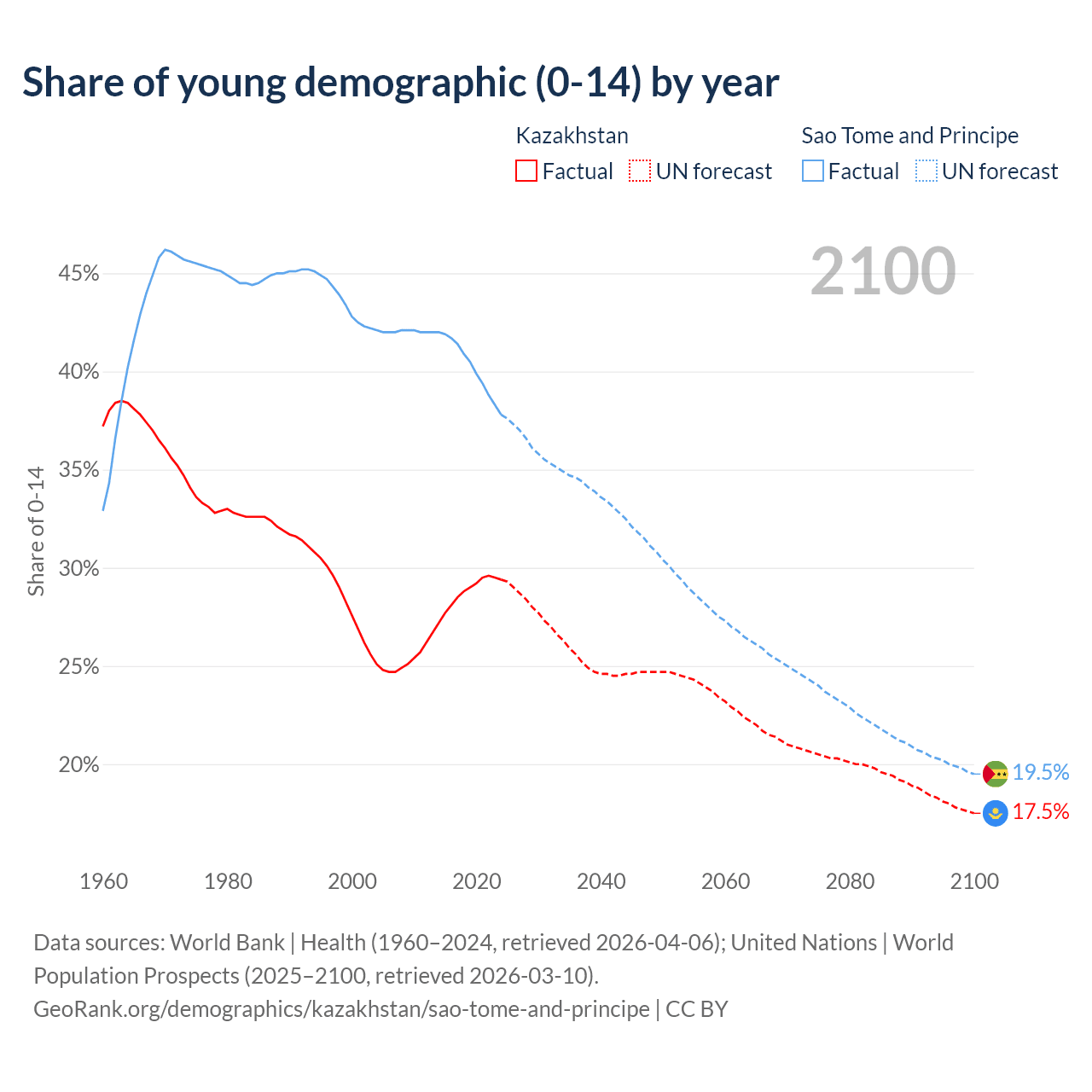 - The share of young demographic (0-15 years old) in Kazakhstan is 29.4% vs 37.8% in Sao Tome and Principe.