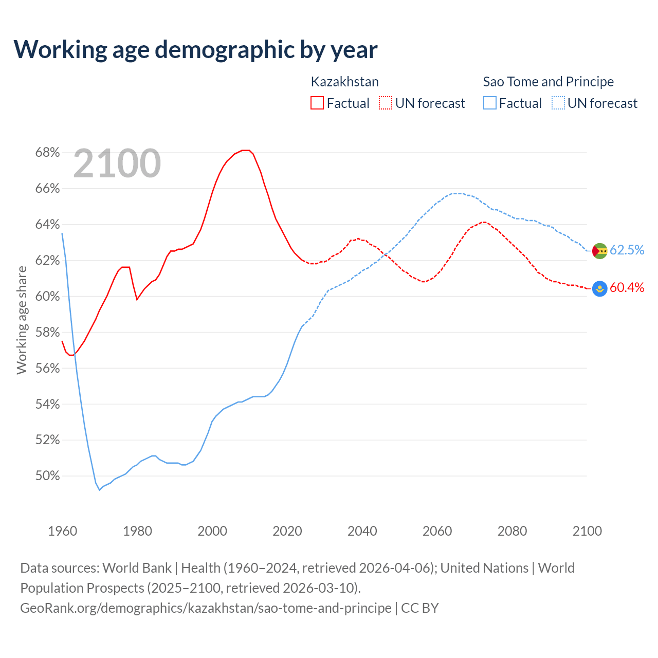 - Kazakhstan has 13.1M working age adults (aged 15-64) vs 144K in Sao Tome and Principe.