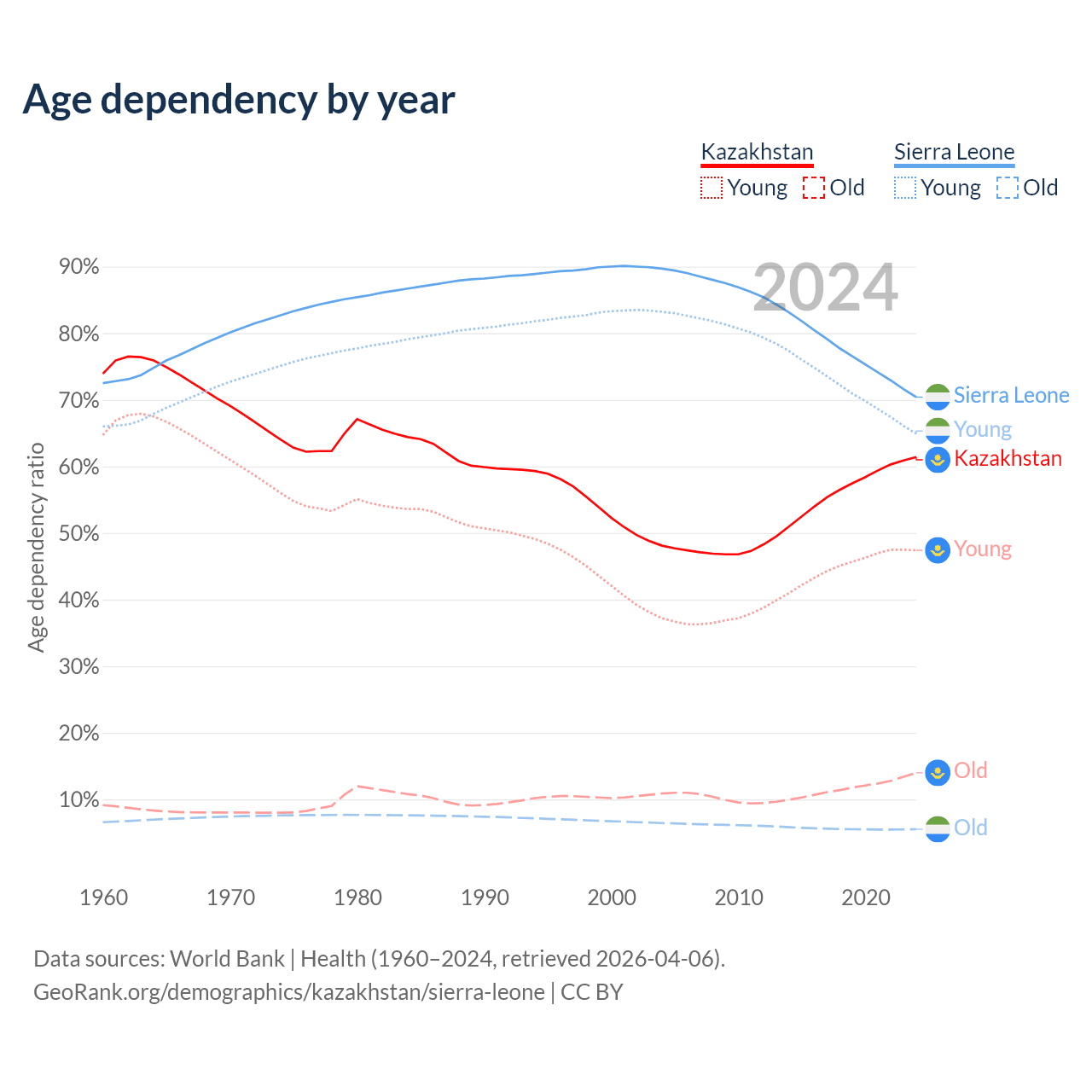 - Kazakhstan is ranked 99/196 by median age (oldest to youngest) vs 161/196 for Sierra Leone.