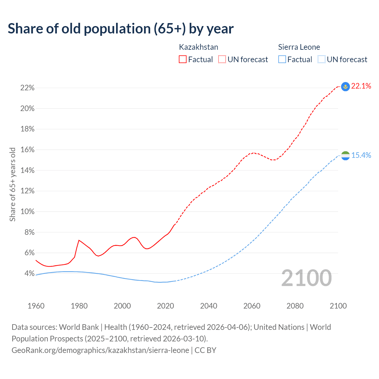 The share of older people aged 65 and over is 8.65% in Kazakhstan and 3.24% in Sierra Leone. Life expectancy in Kazakhstan compared to Sierra Leone .