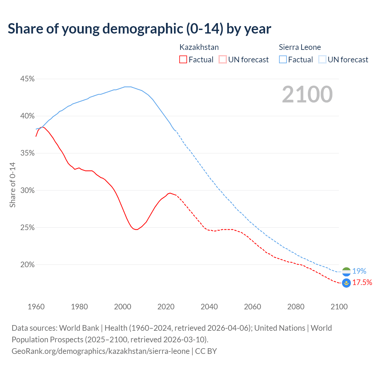 - The share of young demographic (0-15 years old) in Kazakhstan is 29.4% vs 38.1% in Sierra Leone.