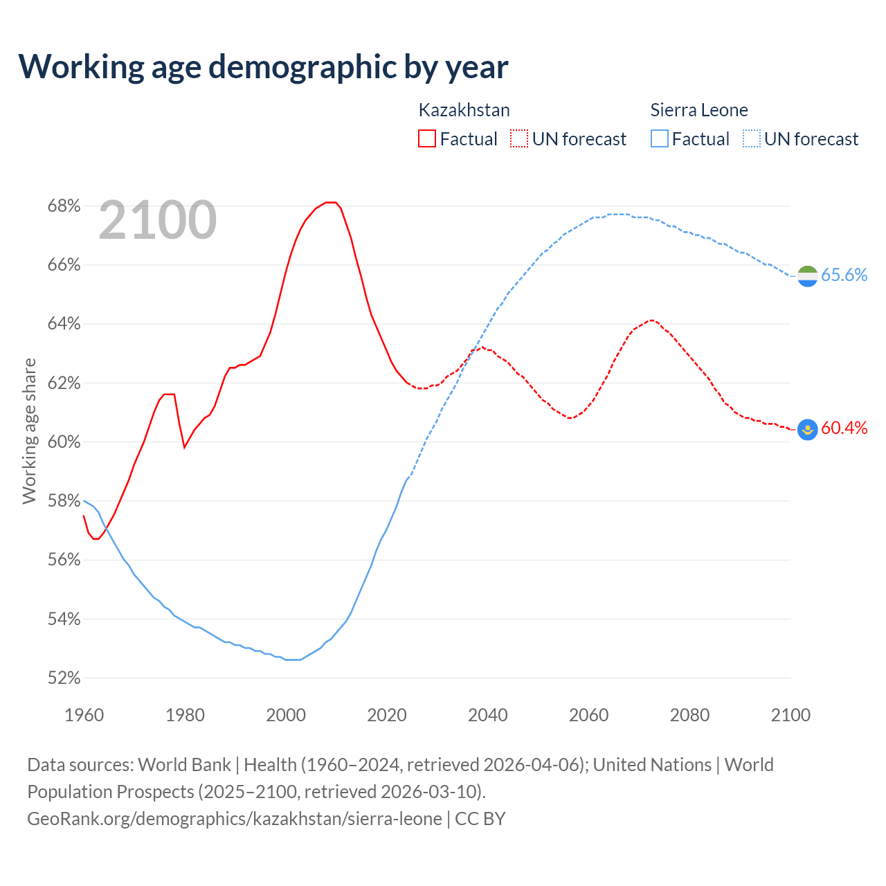 - Kazakhstan has 13.1M working age adults (aged 15-64) vs 5.31M in Sierra Leone.