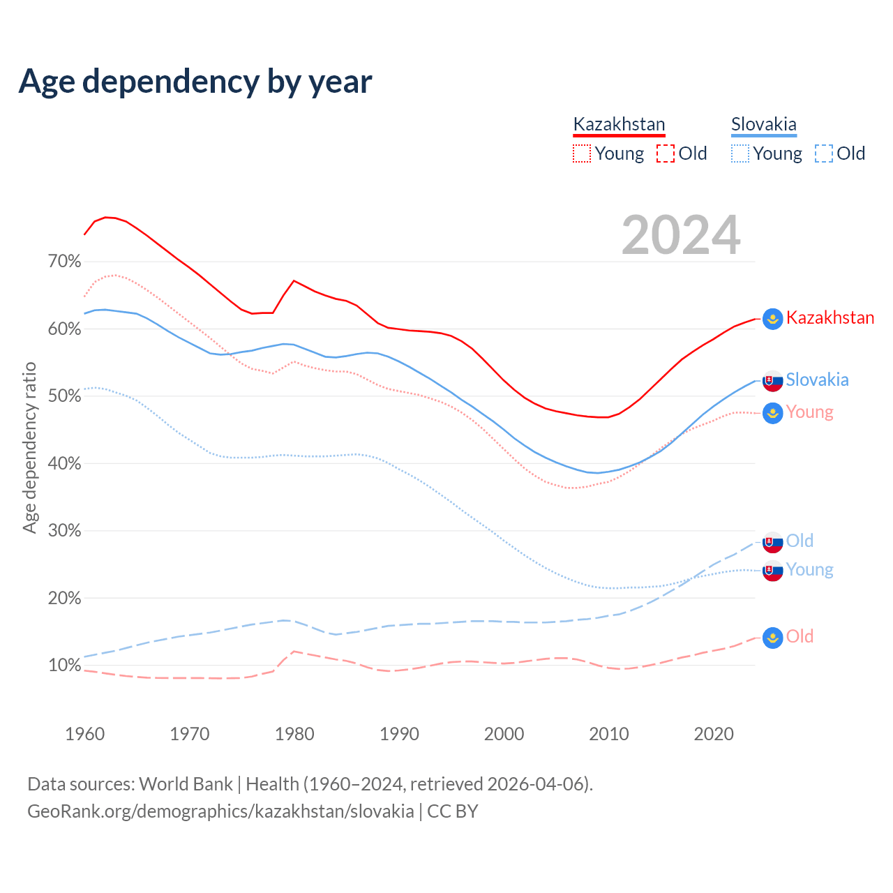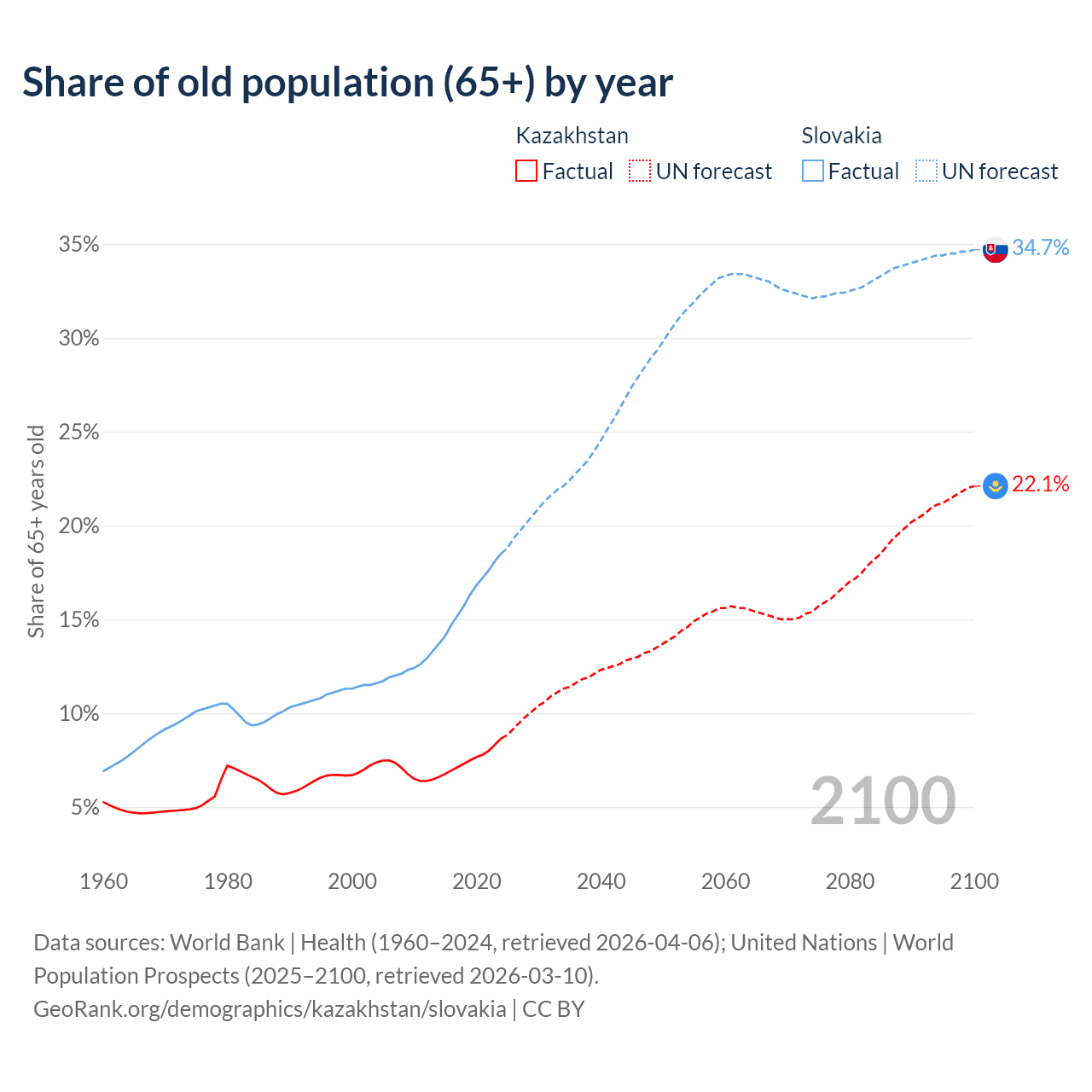 The share of older people aged 65 and over is 8.65% in Kazakhstan and 18.5% in Slovakia. Life expectancy in Kazakhstan compared to Slovakia .
