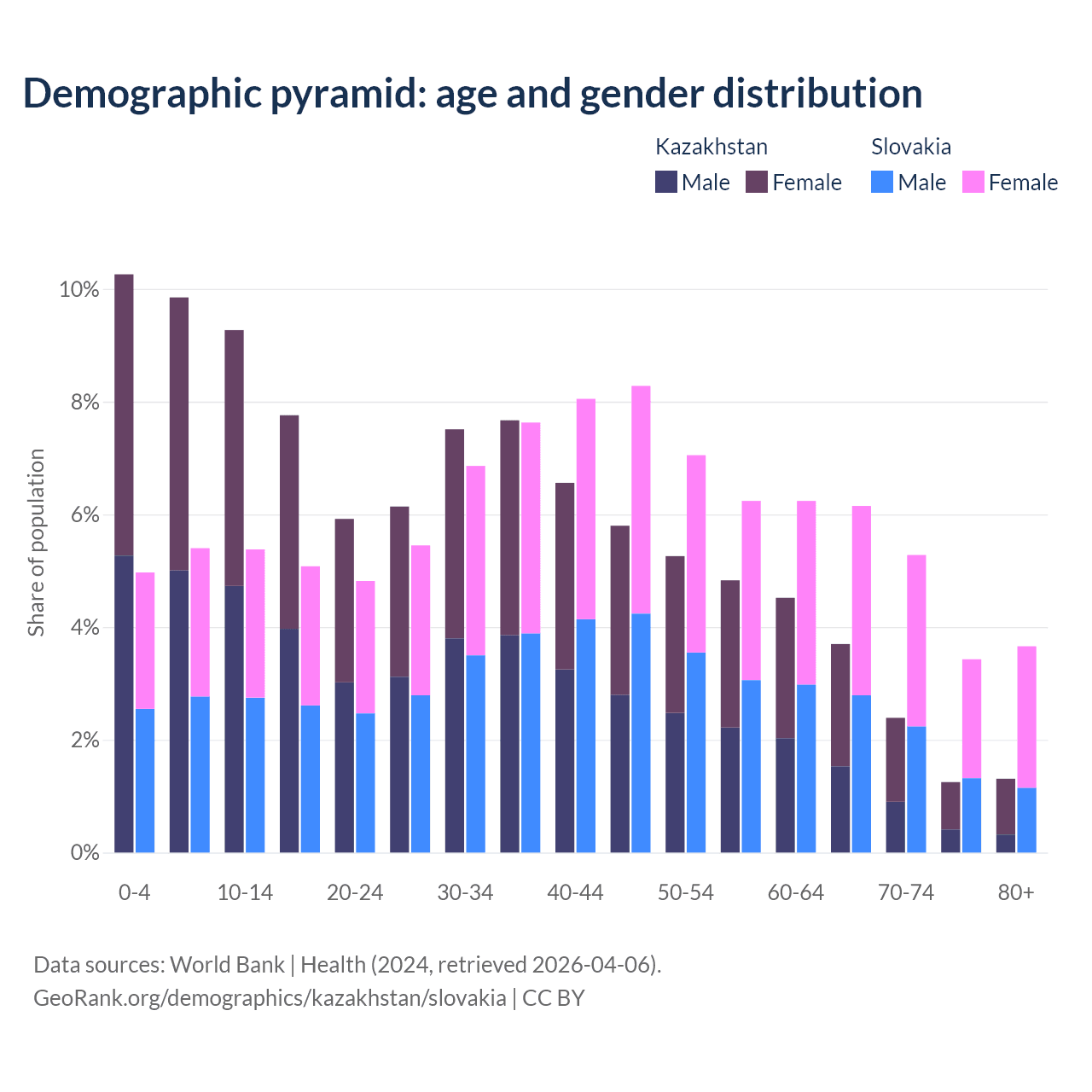 - Kazakhstan is ranked 99/196 by median age (oldest to youngest) vs 31/196 for Slovakia.