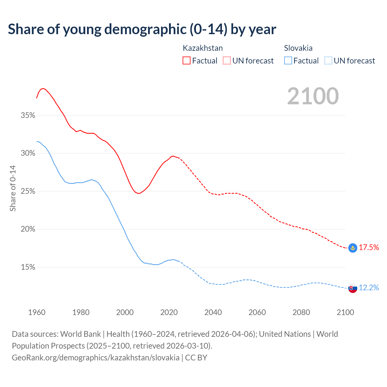 - The share of young demographic (0-15 years old) in Kazakhstan is 29.4% vs 15.8% in Slovakia.