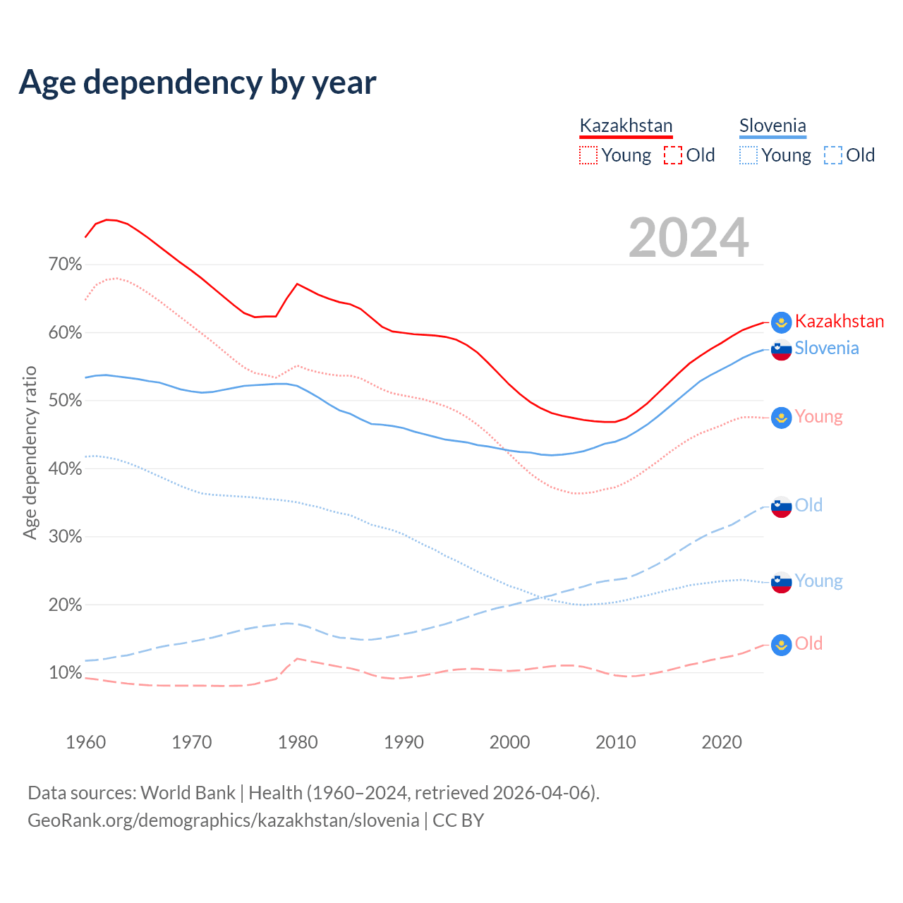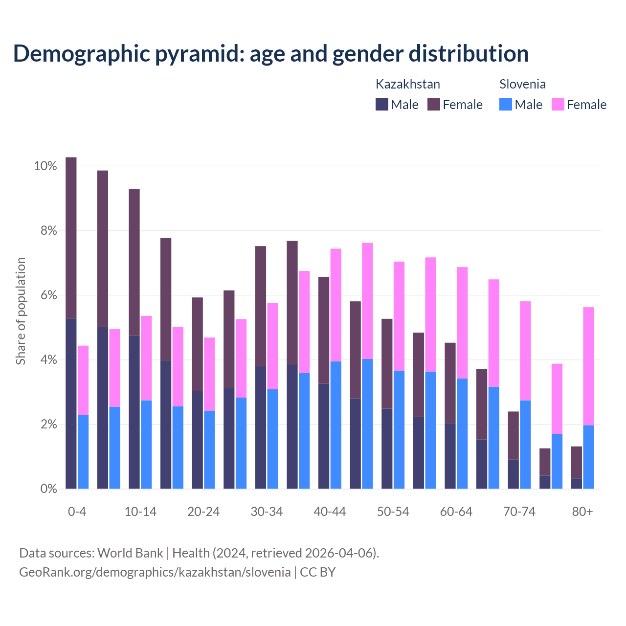 - Kazakhstan is ranked 99/196 by median age (oldest to youngest) vs 14/196 for Slovenia.