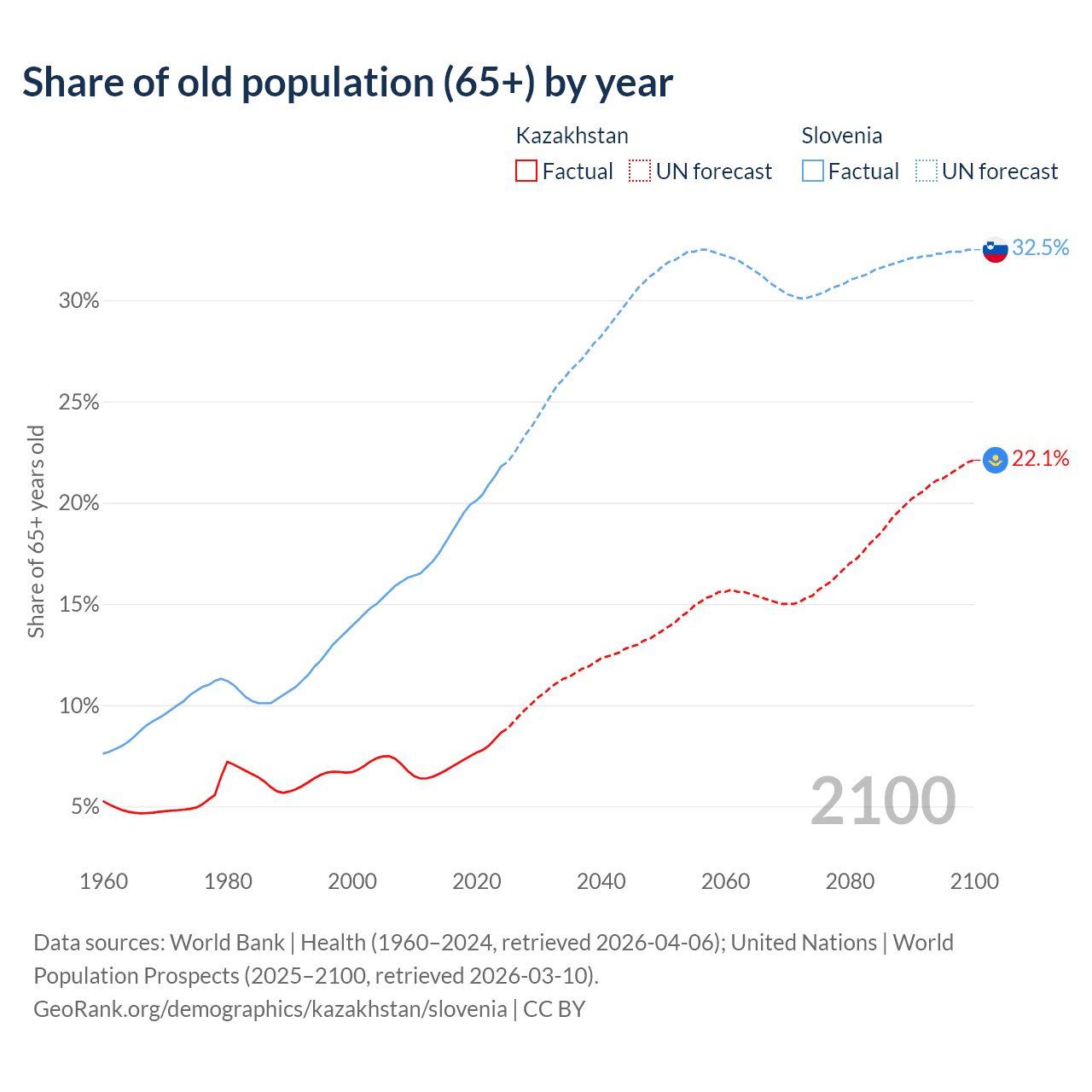 The share of older people aged 65 and over is 8.65% in Kazakhstan and 21.8% in Slovenia. Life expectancy in Kazakhstan compared to Slovenia .