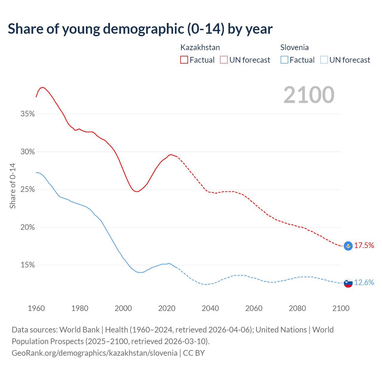 - The share of young demographic (0-15 years old) in Kazakhstan is 29.4% vs 14.7% in Slovenia.