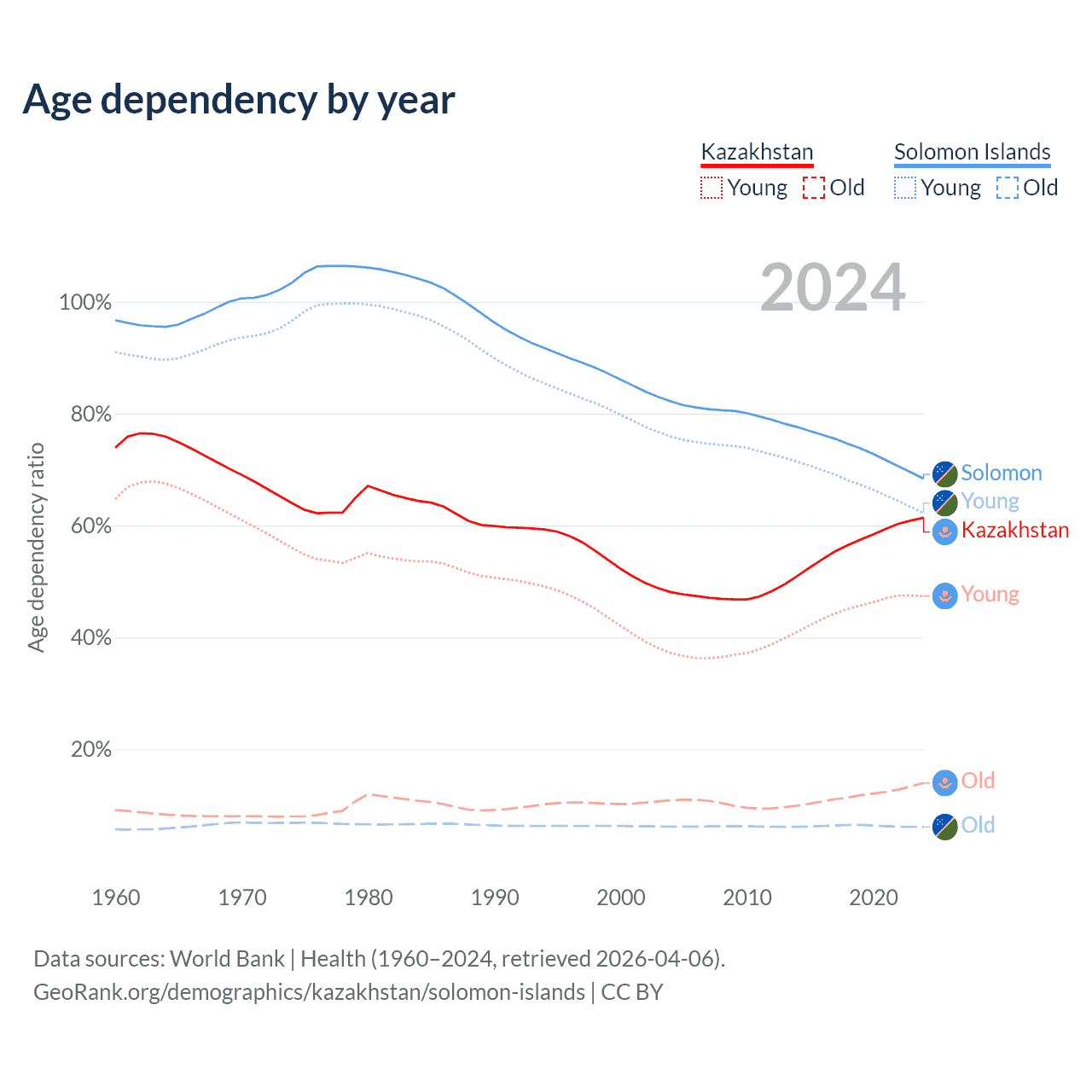 - Kazakhstan is ranked 99/196 by median age (oldest to youngest) vs 153/196 for the Solomon Islands.