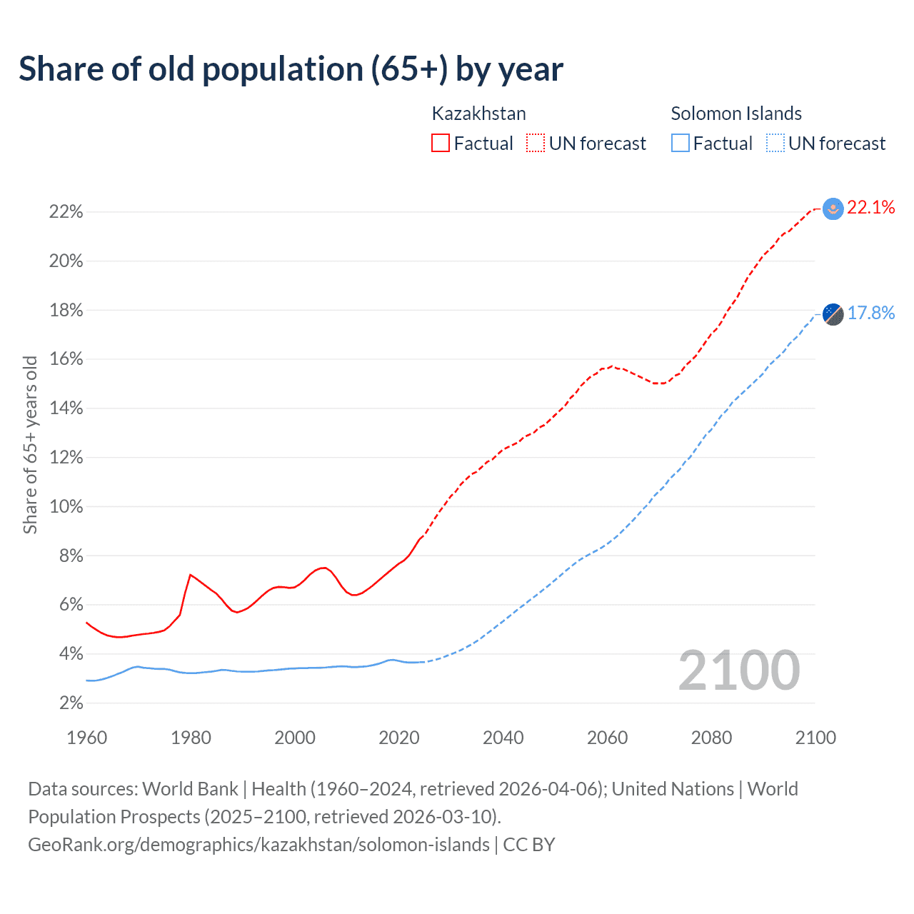 The share of older people aged 65 and over is 8.65% in Kazakhstan and 3.64% in the Solomon Islands. Life expectancy in Kazakhstan compared to the Solomon Islands .